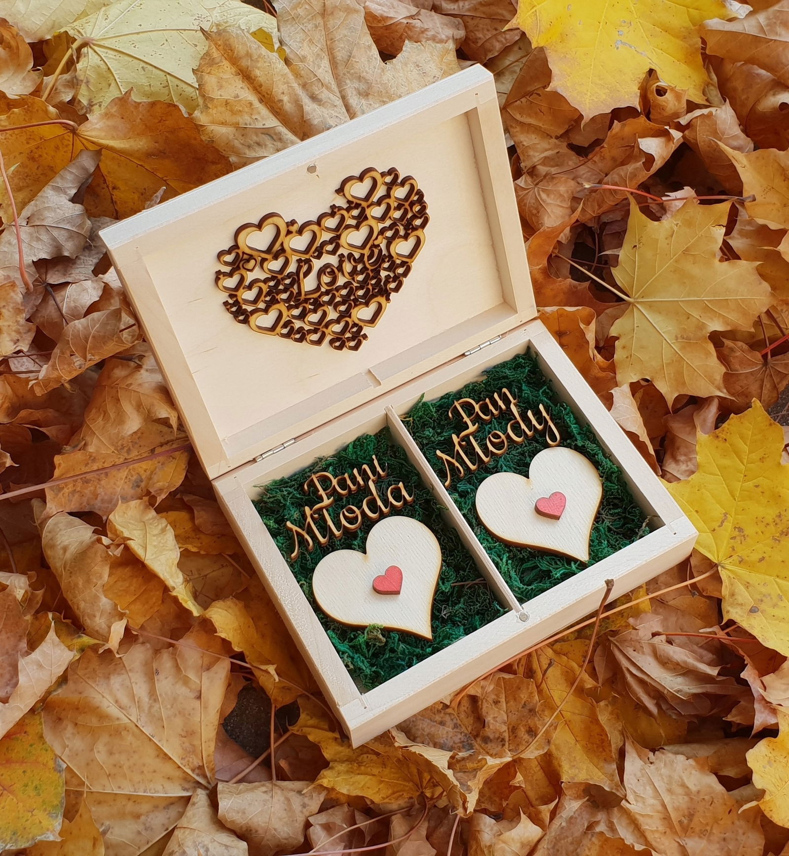 - PUDEŁKO NA OBRĄCZKI ŚLUBNE z mchem w kolorze naturalnym z dodatkiem czerwonych serc