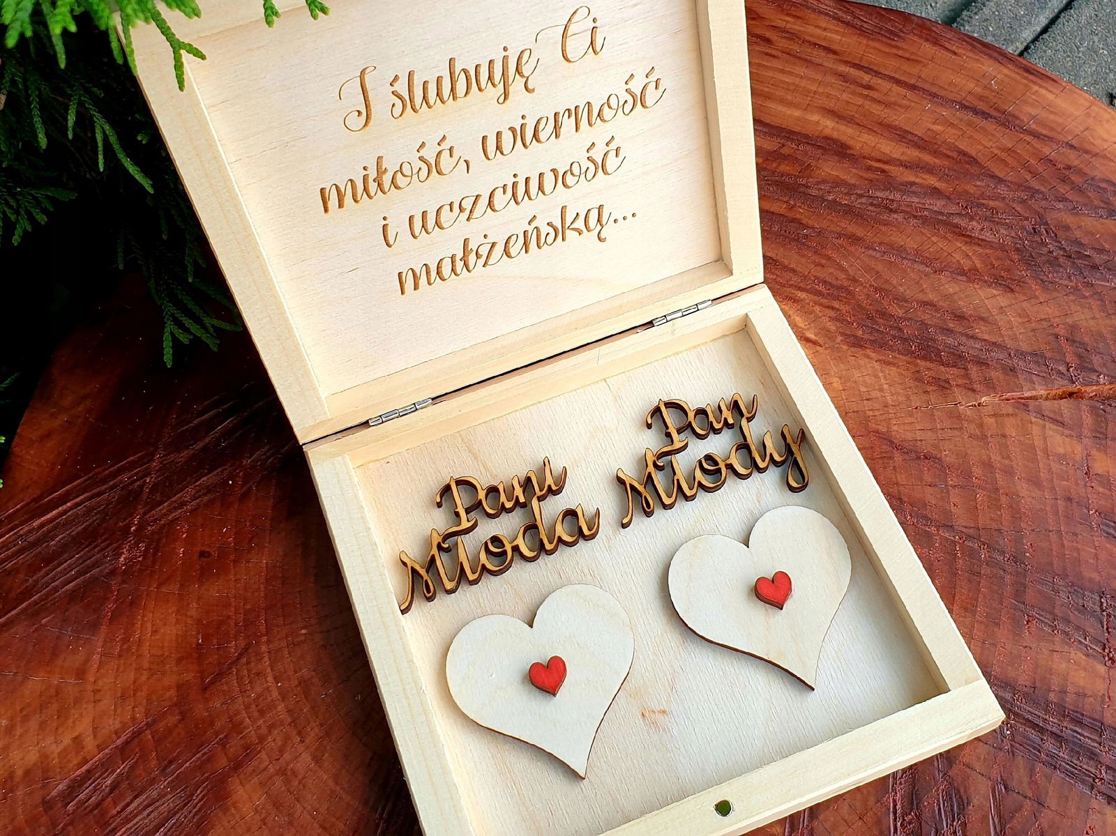 • Pudełko drewniane NA KOPERTY ślubne w kolorze naturalnym z indywidualnym grawerem