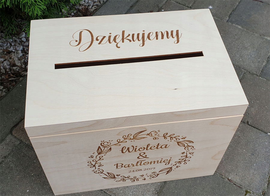 Pudełko drewniane NA KOPERTY ślubne z grawerem na froncie i wierzchu.