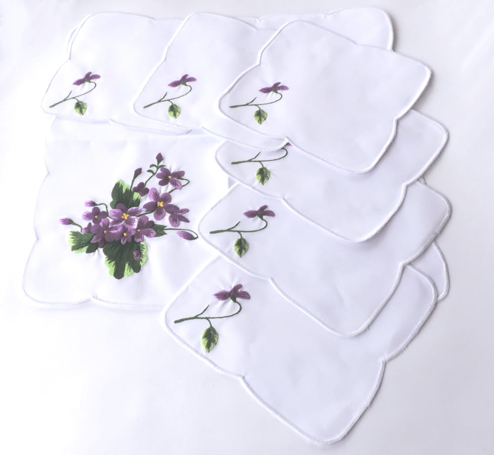 Na większej serwecie widnieje okazały haft z motywem kwiatowym (fiołki), a na pozostałych serwetkach mały motyw nawiązujący do dużej serwety. Razem tworzą jedną nierozłączną całość, która pięknie ozdobi dom.