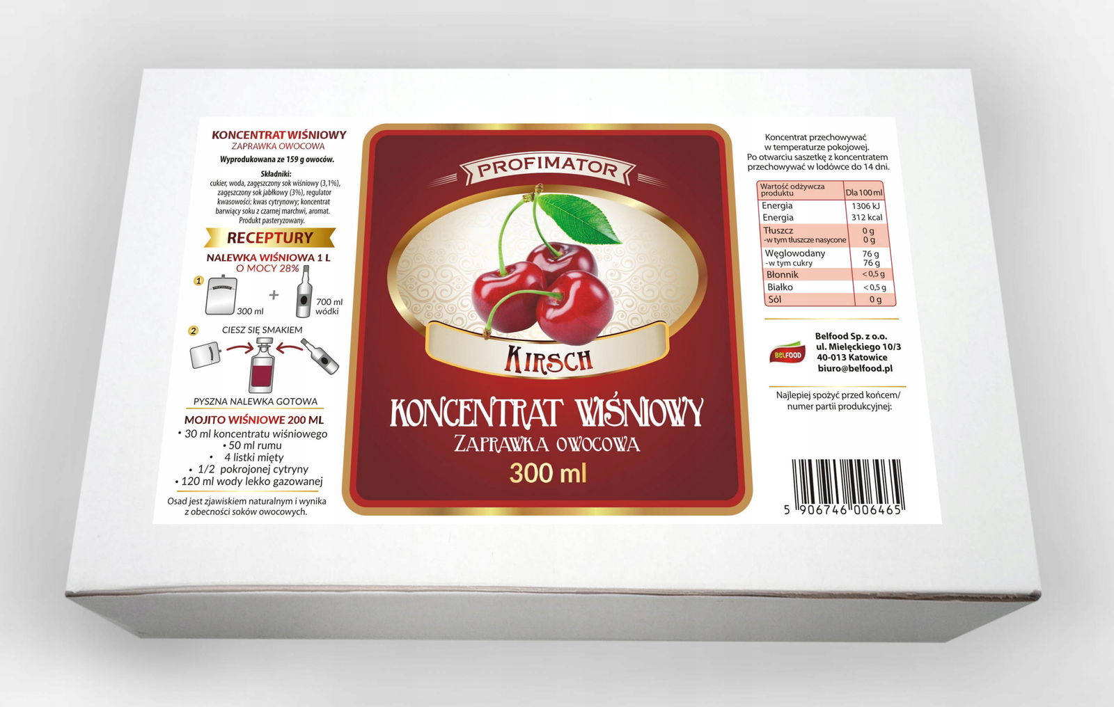 Koncentrat owocowy PROFIMATOR powstał z wytłoczenia owoców do soków oraz zagęszczenia poprzez odparowanie wody. Dla właściwego smaku w likierach dodaje się osobno cukier, owoce i inne komponenty. Zaprawka PROFIMATOR to kompletna receptura -zawiera naturalny sok owocowy, jego słodycz, kwasowość i naturalną barwę. Wystarczy, że do 300 ml produktu dodać 0,7 l wódki i 1 l likieru, czy nalewki o mocy od 28% gotowy. Wiśnie to owoce bogate w witaminy i minerały. Z alkoholem tworzą idealną kompozycję, która stymuluje żołądek do pracy i wspomaga trawienie, zwłaszcza u osób, u których układ pokarmowy nie działa prawidłowo. Ponadto alkohol na bazie wiśni działa oczyszcza nasz organizm z toksyn i pobudza układ krążenia.