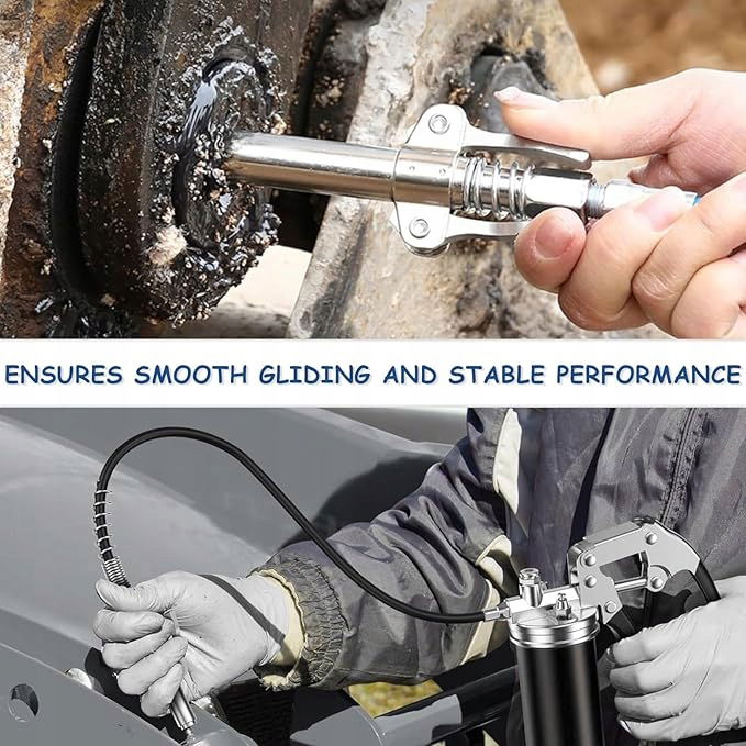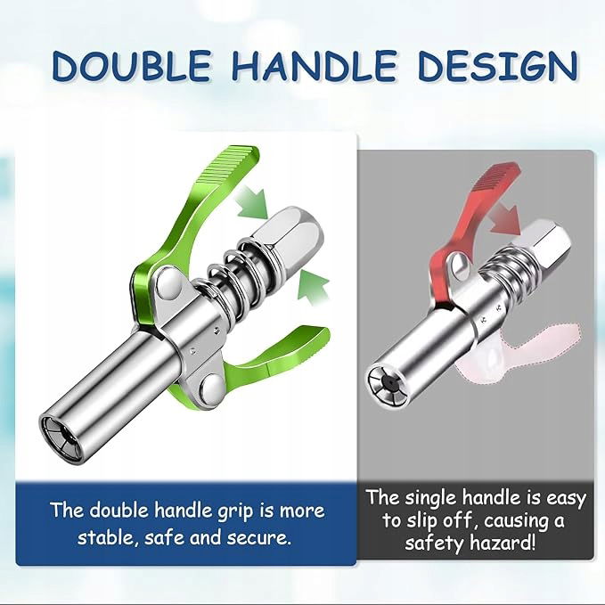 Końcówka wyposażona w podwójny uchwyt z antypoślizgowym designem i gładkim mechanizmem wyciągania umożliwia wygodną obsługę jedną ręką. To sprawia, że smarowanie jest bardziej oszczędne, a sama końcówka łatwa w montażu i użyciu.