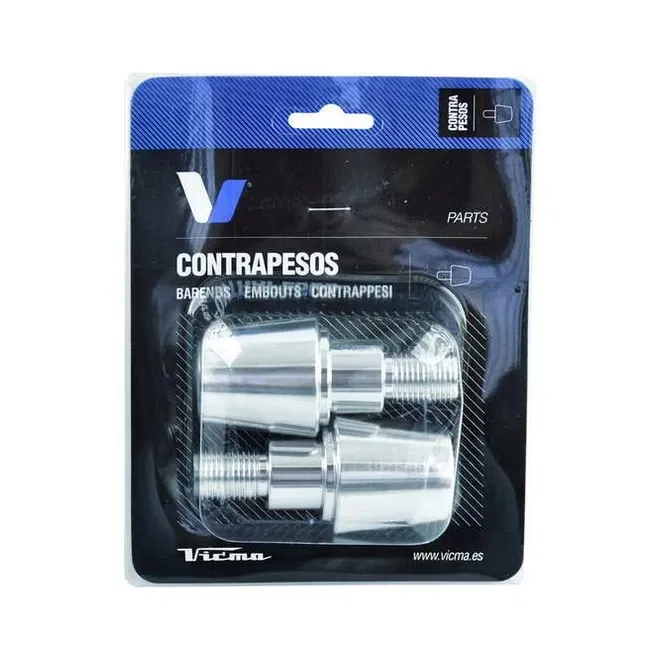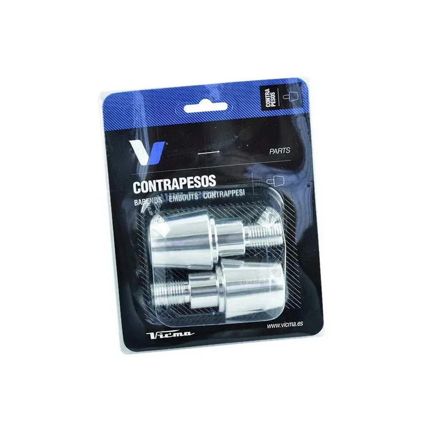 Końcówki kierownicy VICMA V Parts o średnicy montażowej 13,5 mm, w kolorze srebrnym. Służą do montażu na końcach kierownicy, pomagając w redukcji wibracji oraz chroniąc kierownicę w przypadku upadku. Wykonane z trwałego materiału, zapewniają estetyczne wykończenie.