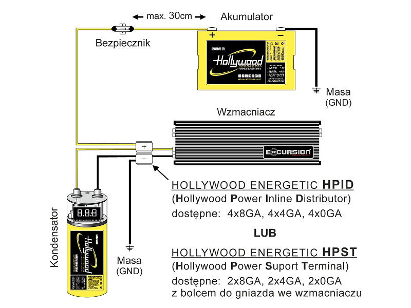 - Kondensator buforowy do instalacji car audio 12 V (nie stosować w instalacji 24 V)