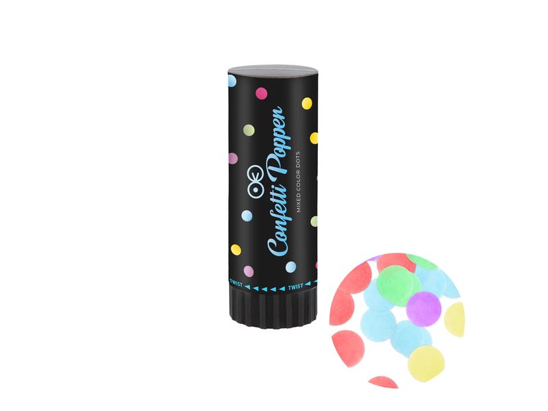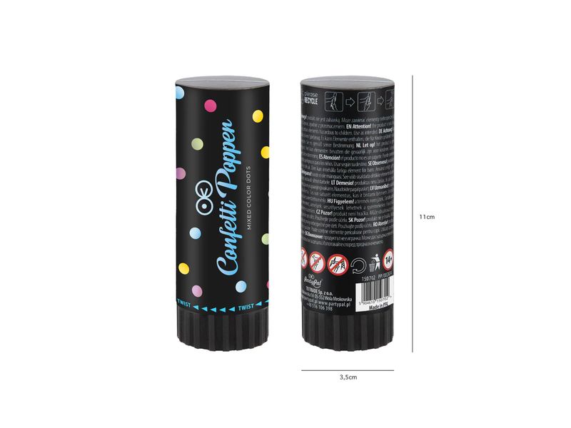 Oferowany model strzela konfetti w kształcie kolorowych kółek, a tuba ma wysokość 11 cm.