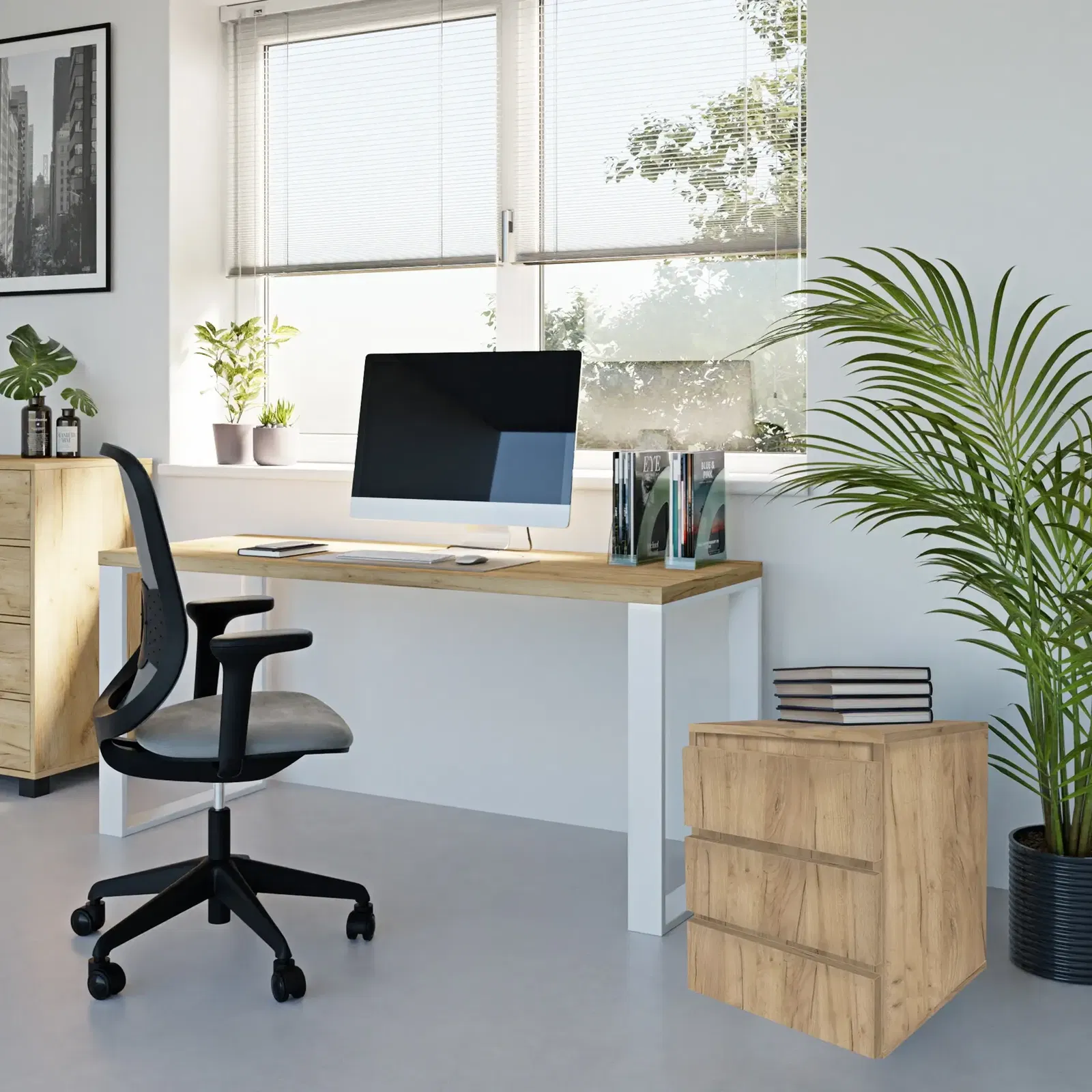 Biały – klasyczna elegancja pasująca do każdego wnętrza. Antracyt – nowoczesny, stylowy odcień dodający charakteru. Dąb złoty – ciepły, naturalny kolor wprowadzający przytulność. Dąb Sonoma – uniwersalny odcień drewna łączący nowoczesność z naturą. Trzy pojemne szuflady – umożliwiają wygodne przechowywanie dokumentów, przyborów biurowych i innych akcesoriów, pomagając utrzymać porządek.