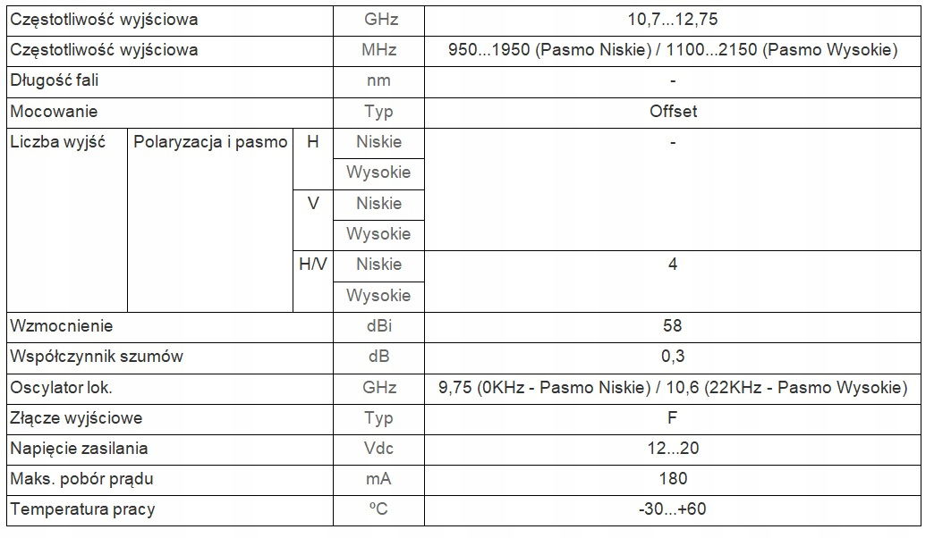 - Częstotliwość wejściowa: 10,7 - 12,75 GHz