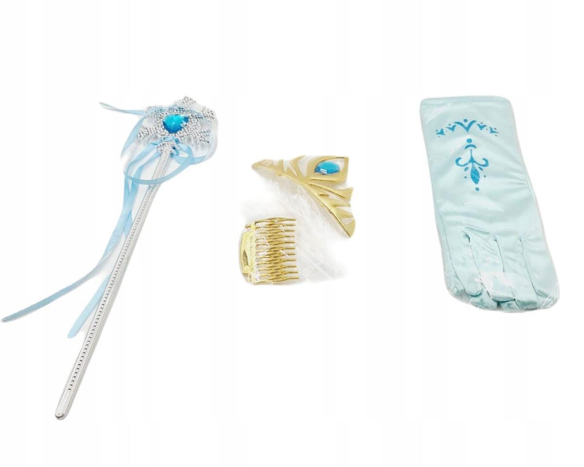 Cały zestaw dla księżniczki jest ozdobiony błyszczącymi detalami w połączeniu z niebieskim klejnotem artystycznym i niebieską krawędzią. Idealny dodatek do różnych strojów księżniczki, takich jak Elsa, Kopciuszek, Aurora i Roszpunka.