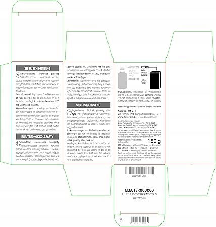 - Naturalny środek wspomagający: suplement diety z korzenia tajgi lub żeń-szenia syberyjskiego (Eleutherococcus senticosus) w formie tabletek. 4 tabletki zawierają 1200 mg korzenia tajgi lub żeń-szenia syberyjskiego.