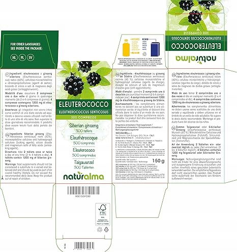 - Korzeń tajgi lub żeń-szenia syberyjskiego (Eleutherococcus senticosus) 300 tabletek po 500 mg (format 150 gramów). Wykonane w formie tabletek (nie kapsułek ani miękkich żelów). 1 tabletka zawiera 300 mg korzenia tajgi lub żeń-szenia syberyjskiego.