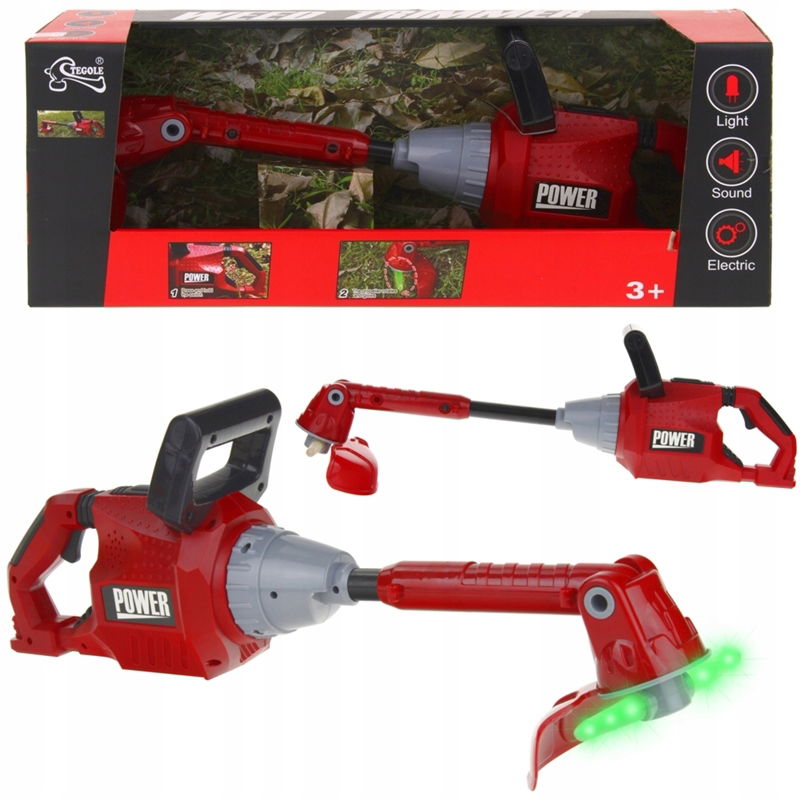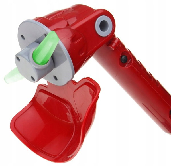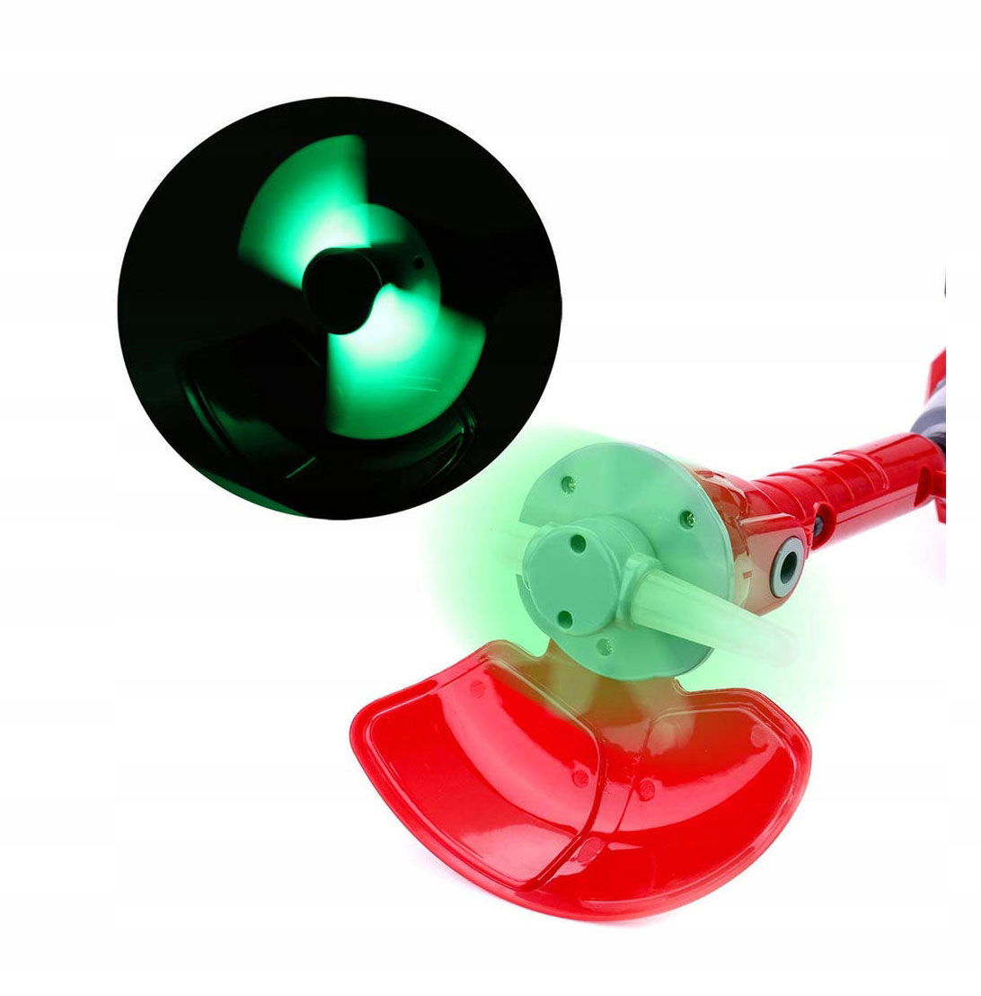 ✔️ By rozpocząć zabawę, należy wcisnąć guzik znajdujący się po wewnętrznej stronie rączki. Wciskanie go sprawi, że przeźroczyste, gumowe ostrze, zacznie się kręcić i świecić na zielono. Zabawę urozmaicą dźwięki charakterystyczne dla pracy silnika oraz wykaszania trawy. Ostrze oddzielono ochronną osłonką, służącą do regulowania kąta nachylenia ostrza. Rura teleskopowa, na której osadzone jest ostrze, posiada guziczek umożliwiający regulację jej długości.