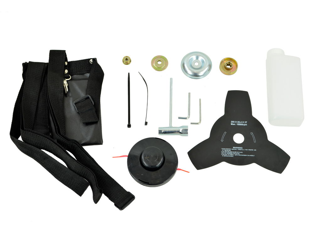 W zestawie znajduje się żyłkowa głowica tnąca posiadająca automatyczny system podawania żyłki oraz dodatkowa trójzębna tarcza tnąca, która w szybki i łatwy sposób pozwala uporać się z chwastami. łodygami, odrostami drzew i krzewów, itp. Szerokość robocza głowicy żyłkowej wynosi 42 cm a tarczy tnącej 25.5 cm.