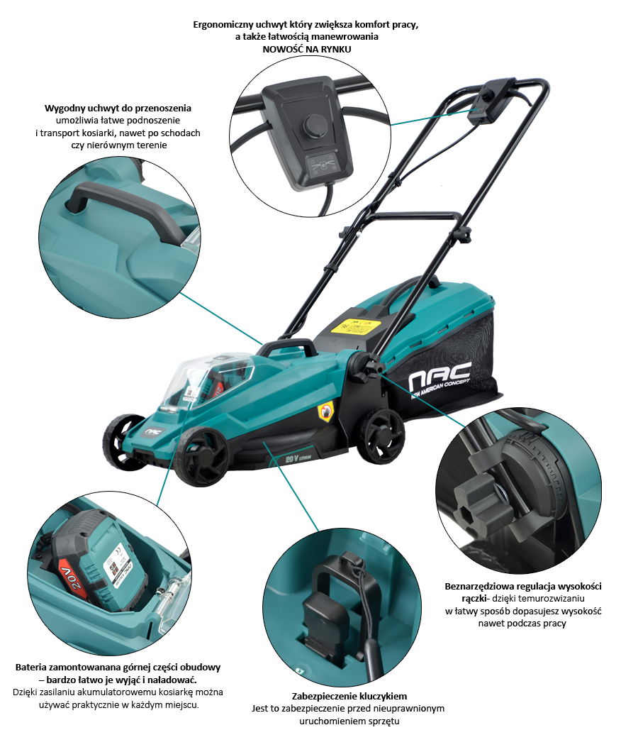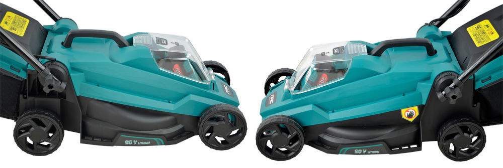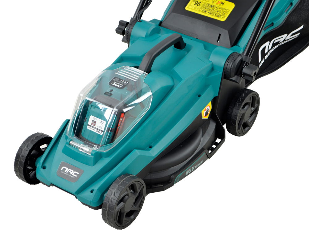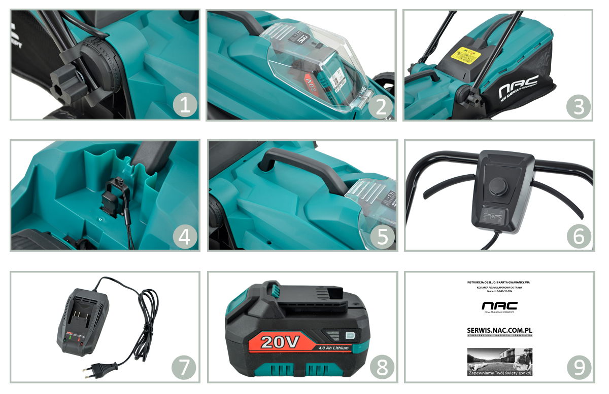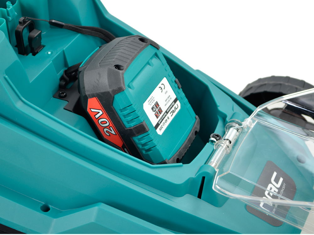 Kosiarka należy do grupy akumulatorowych urządzeń ogrodowych NAC 20 V, gdzie zastosowano jeden typ akumulatorów pasujący do wielu urządzeń. Pasujący akumulator występuje w wersji o różnych pojemnościach 2 Ah, 4Ah, 5 Ah oraz 6 Ah.