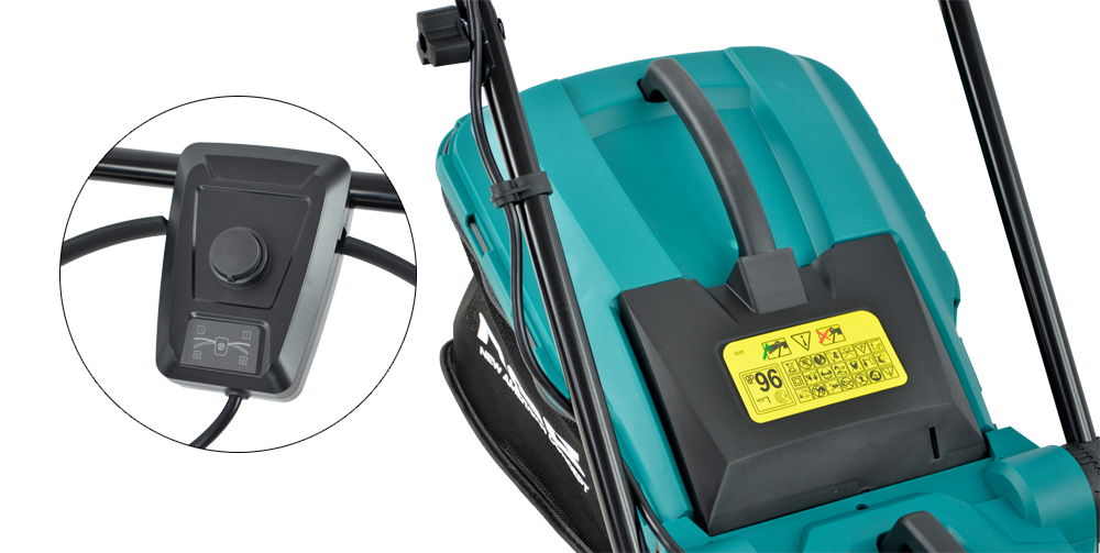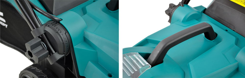 Posiada szerokie koła przez co kosiarka prowadzi się bardzo lekko. Obudowa kosiarki wykonana została ze specjalnego tworzywa sztucznego odpornego na uderzenia kamyków.