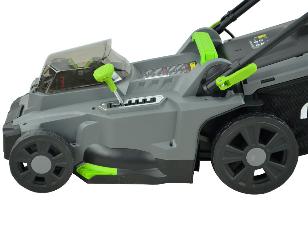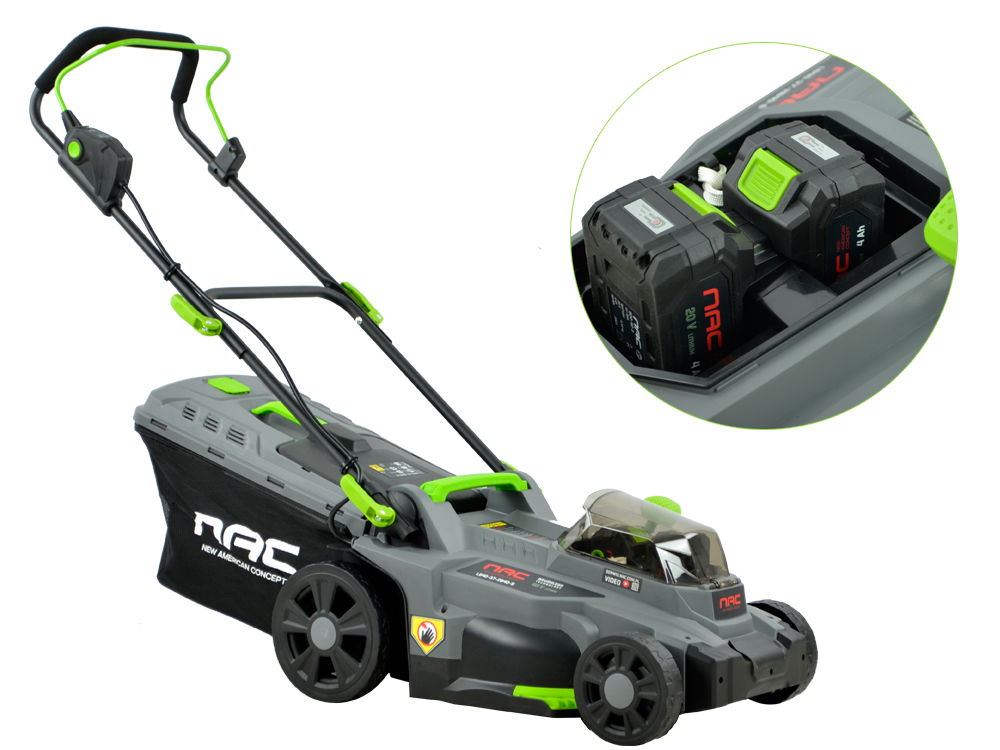 Akumulatorowa kosiarka do trawy zasilana z dwóch akumulatorów litowo-jonowych o napięciu 20 V i pojemności aż 4 Ah. ( 40 V, 8 Ah ) Szerokość koszenia 37 cm.