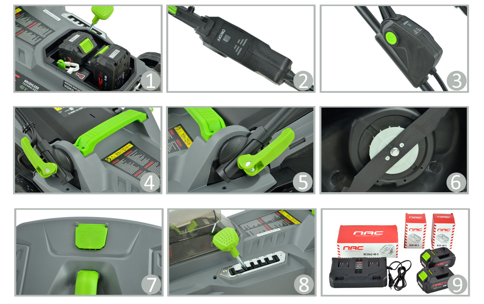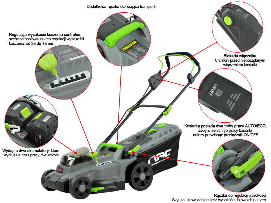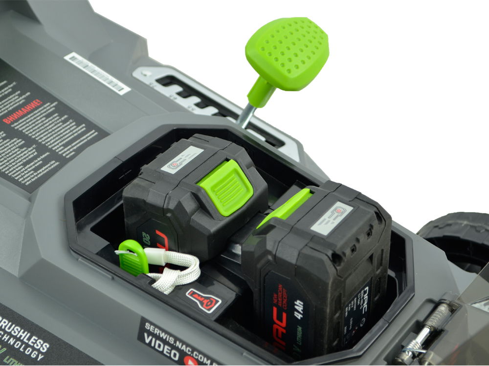 Kosiarka należy do grupy akumulatorowych urządzeń ogrodowych NAC "Akumultisystem 20 V", gdzie zastosowano jeden typ akumulatorów pasujący do wielu urządzeń. Pasujący akumulator występuje w wersji o różnych pojemnościach 2 Ah, 4 Ah oraz 5 Ah.