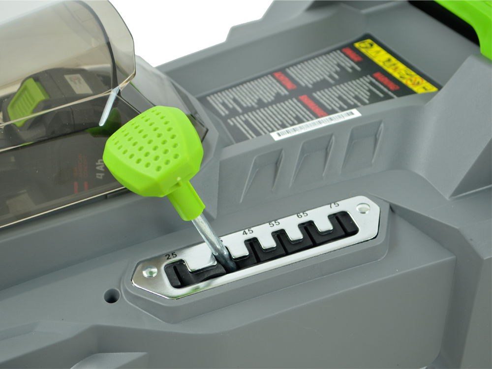 Posiada 6 stopniową centralną regulację wysokości koszenia od 2,5 do 7,5 cm. (Wszystkie cztery koła podnosimy lub opuszczamy jednocześnie za pomocą jednej centralnej dźwigni.)