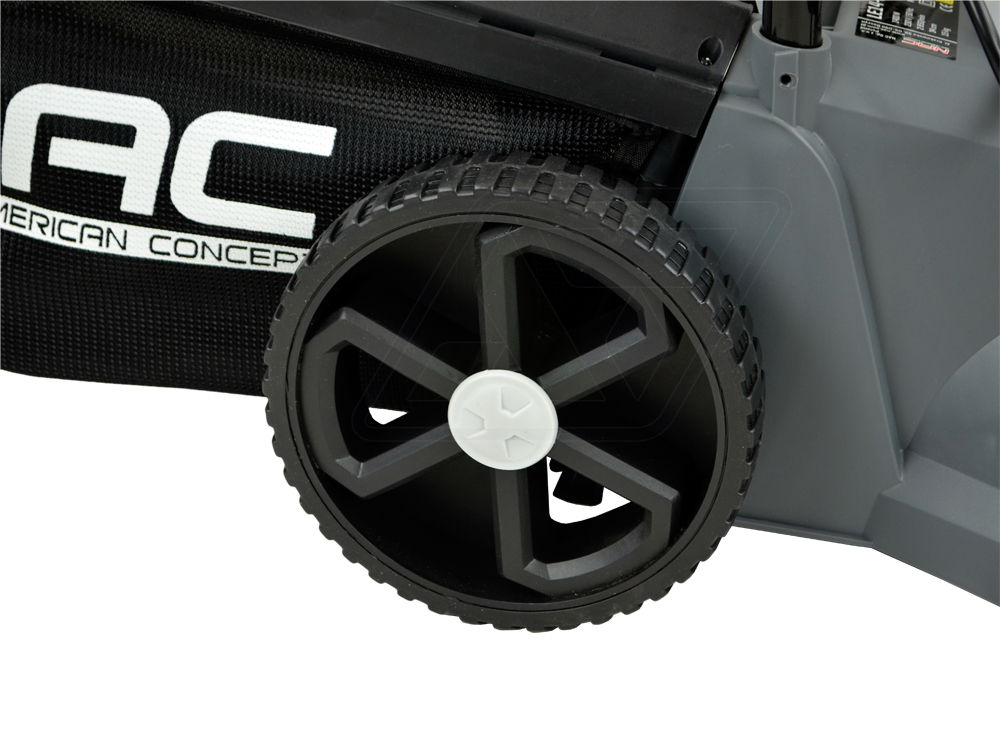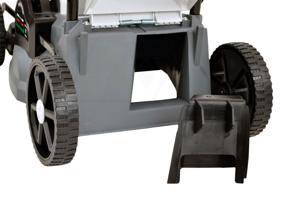Obudowa kosiarki wykonana została z tworzywa sztucznego odpornego na uderzenia i pęknięcia. Bardzo mała waga - bo tylko 15 kg sprawia, że kosiarka prowadzi się łatwo i wygodnie. Średnica kółek przednich wynosi 17 cm oraz tylnych 19,5 cm.