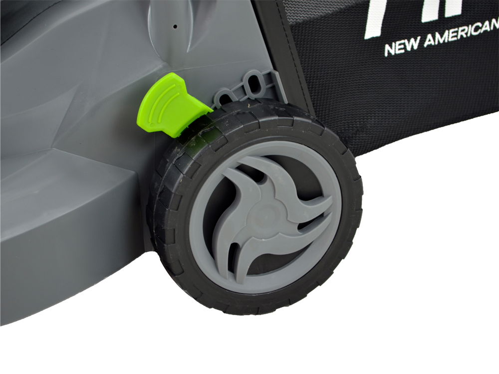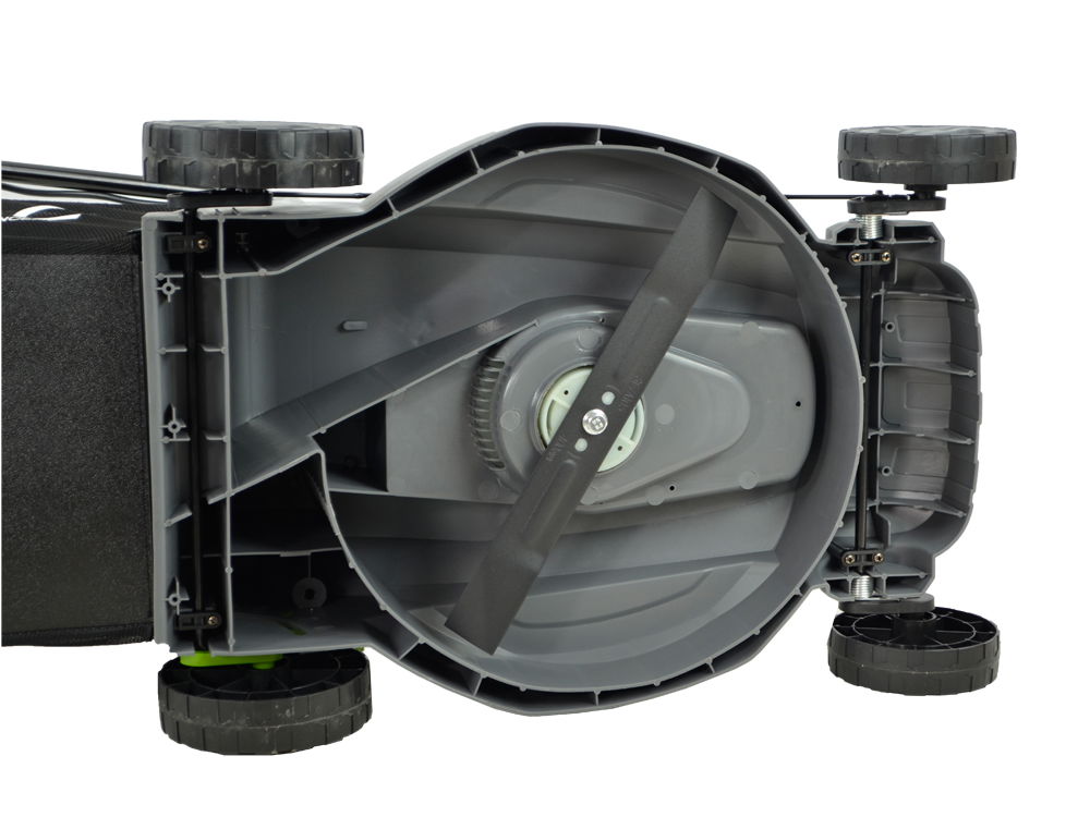 Posiada duże koła o średnicy 13,7 cm - przednie oraz 16 cm - tylne przez co kosiarka prowadzi się bardzo lekko. Obudowa kosiarki wykonana została ze specjalnej mieszanki wysokogatunkowego tworzywa sztucznego odpornego na uderzenia kamyków.