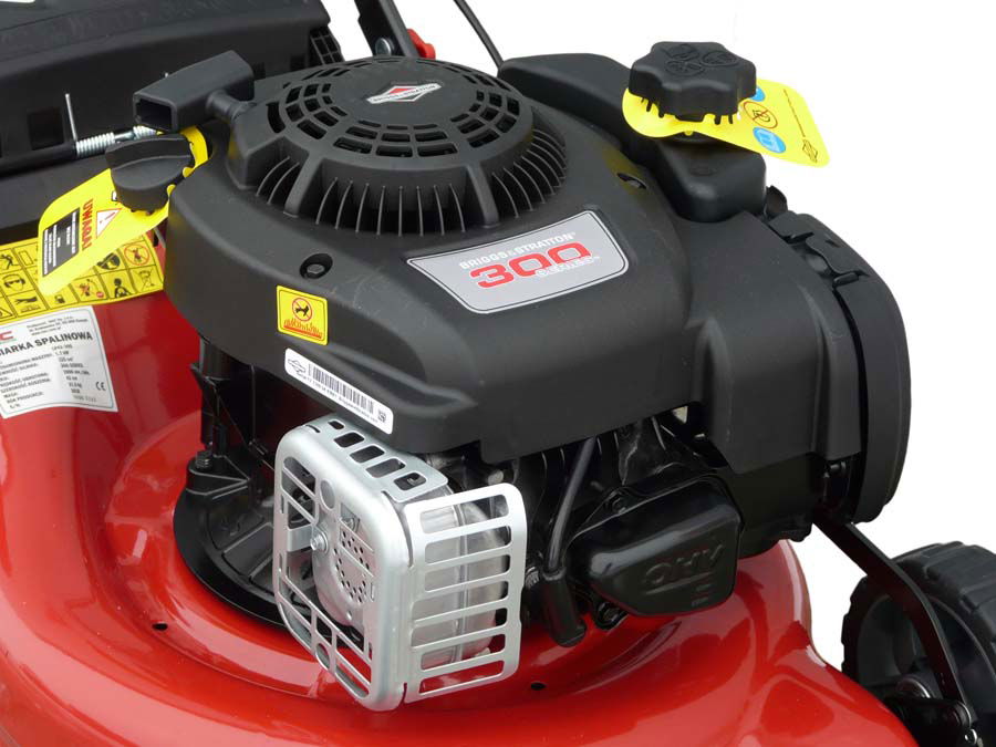 Lekka kosiarka spalinowa bez napędu. Silnik Briggs&Stratton o pojemności 125 cc. Szerokość koszenia 42 cm.
