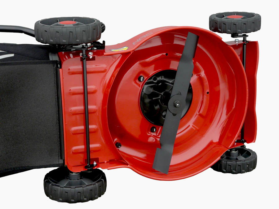 Posiada łożyskowane koła o średnicy 15 cm - przednie oraz 18 cm - tylne przez co kosiarka prowadzi się bardzo lekko. Obudowa kosiarki wykonana została ze stalowej blachy malowanej proszkowo odpornej na uderzenia kamyków i rdzę.