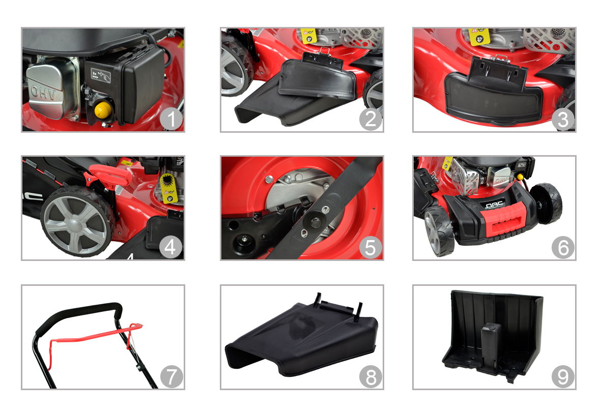 - Centralna, 8 stopniowa regulacja wysokości koszenia ustawiana za pomocą jednej dźwigni