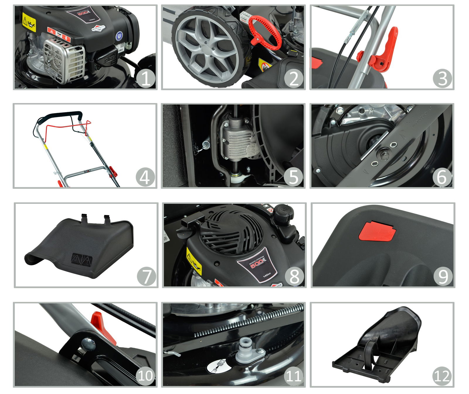 Napęd, mulczowanie, samoczynne mycie obudowy, wyrzut tylny, wyrzut boczny, wyrzut do kosza, centralna regulacja wysokości koszenia, edge cutting