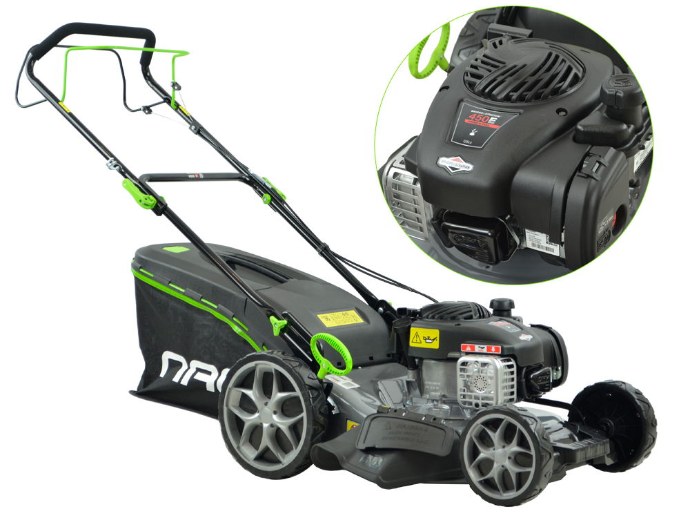 Wielofunkcyjna kosiarka spalinowa z napędem. Silnik Briggs&Stratton 450 E Series. Szerokość koszenia 46 cm. Dodatkowy wyrzut boczny oraz funkcja mulczowania trawy