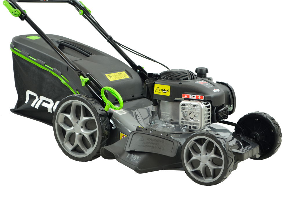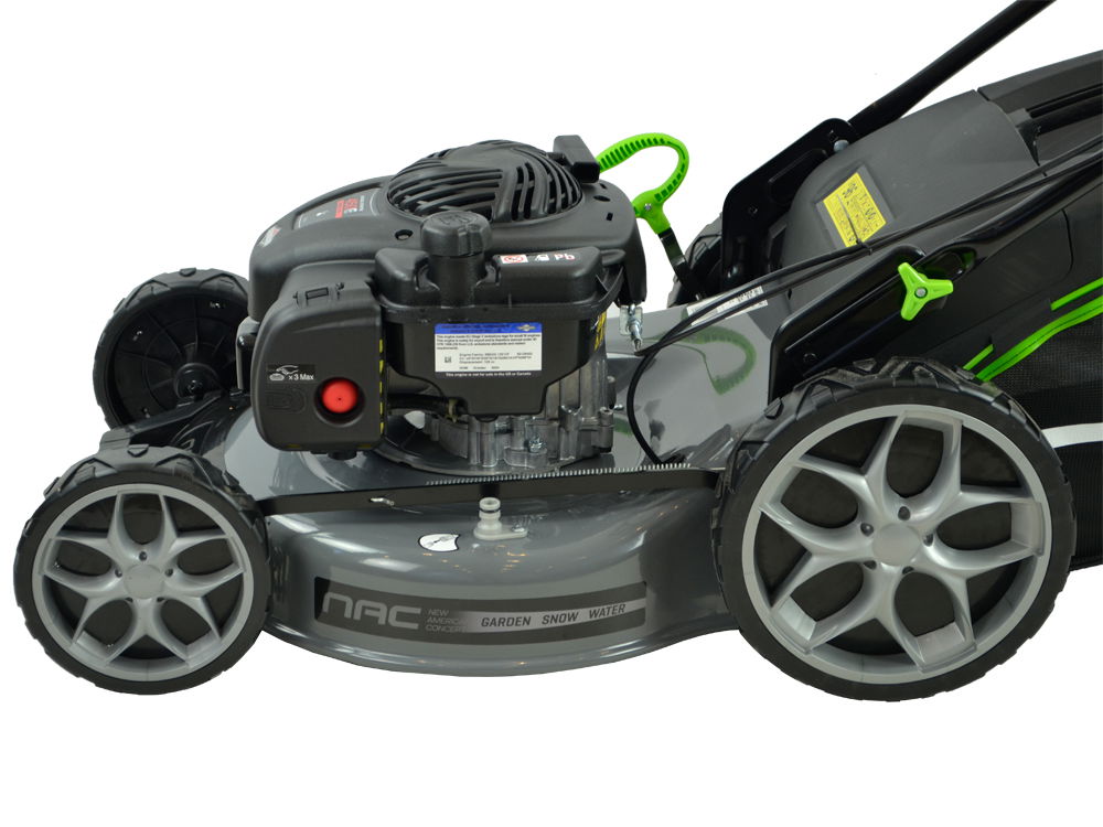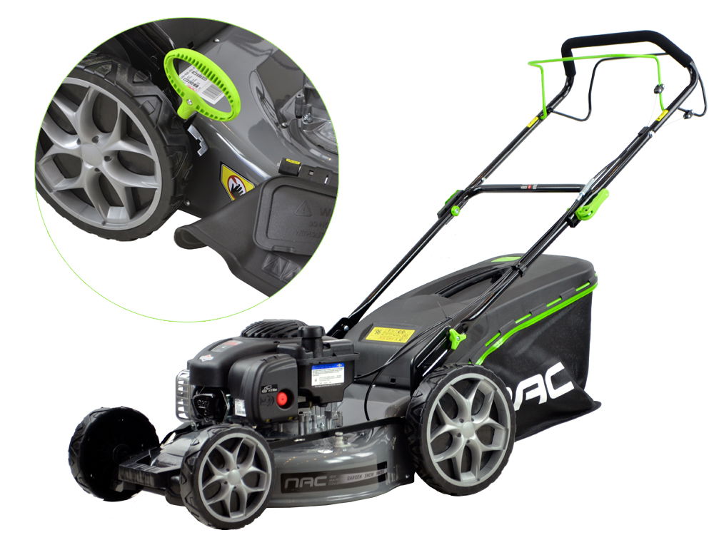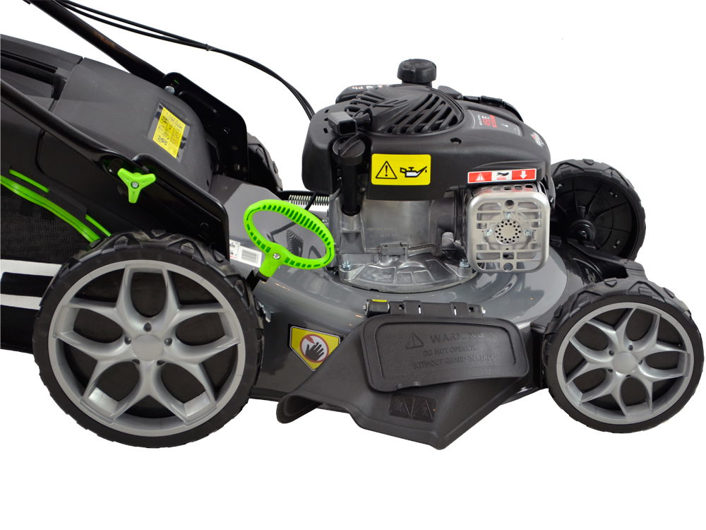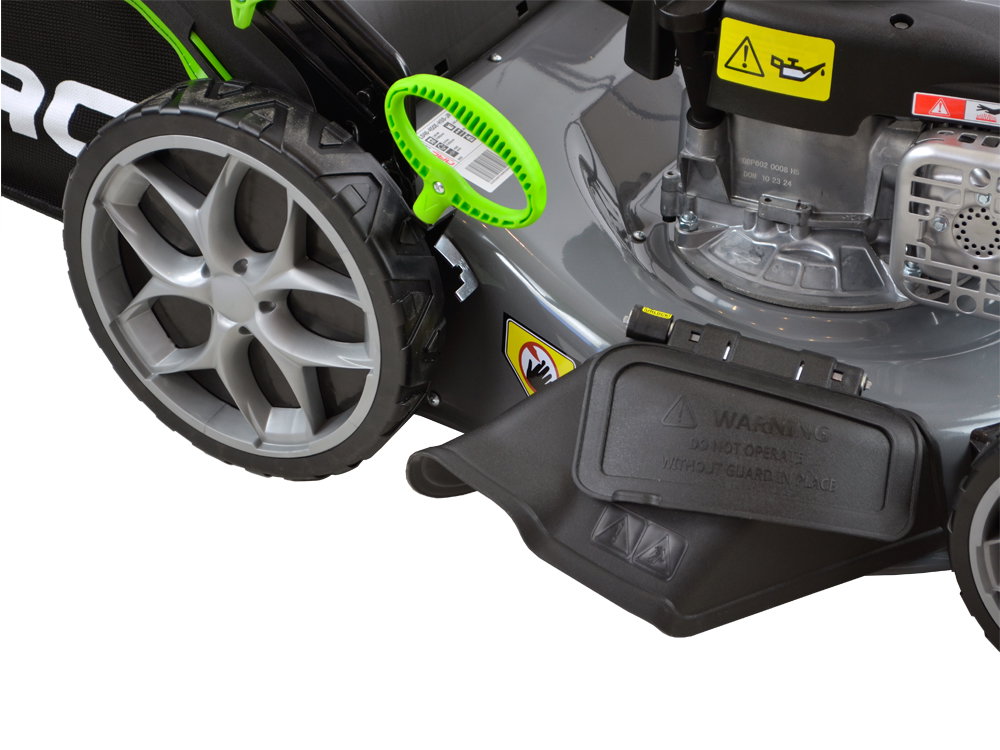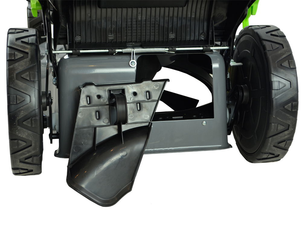 Posiada duże łożyskowane koła o średnicy 20 cm - przednie oraz 28 cm - tylne przez co kosiarka prowadzi się bardzo lekko. Obudowa kosiarki wykonana została ze stalowej blachy malowanej proszkowo odpornej na uderzenia kamyków i rdzę.