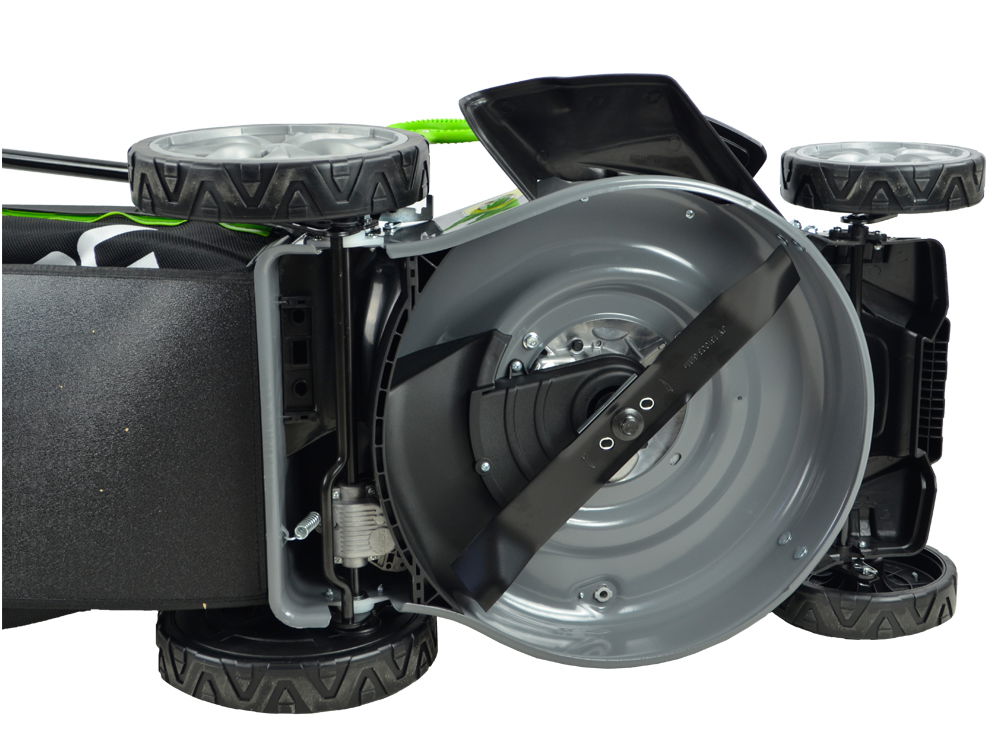 System samoczynnego mycia obudowy, w który wyposażona jest kosiarka znacznie ułatwia mycie spodniej części urządzenia. Wystarczy po koszeniu podłączyć wąż ogrodowy i uruchomić kosiarkę, a obracający się nóż rozprowadzi wodę, która usunie zalegającą trawę i ziemię.