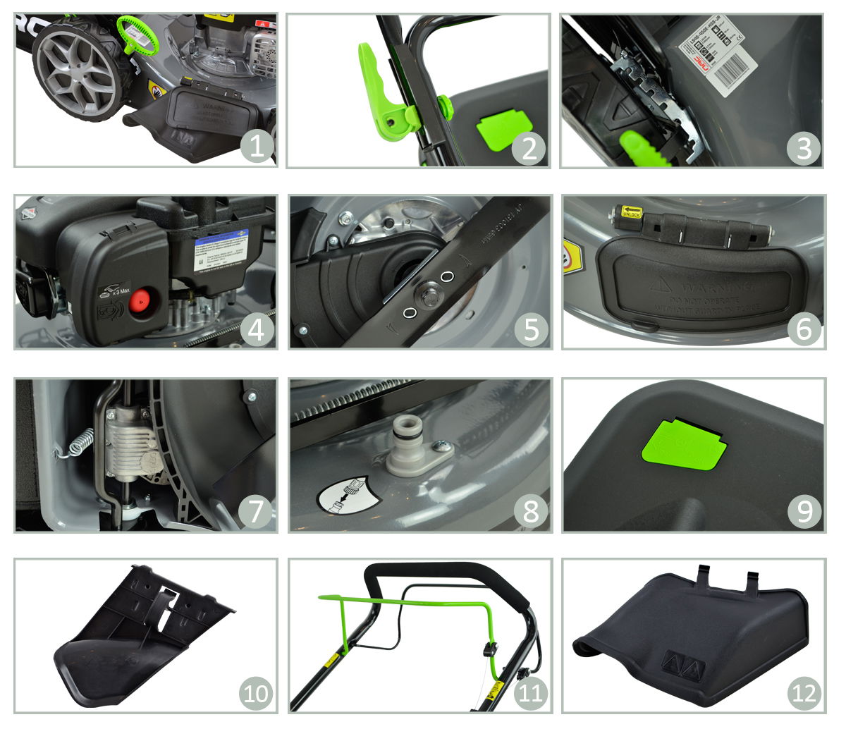 - Wyrzut trawy - boczny, tylny, tylny do kosza, funkcja mulczowania