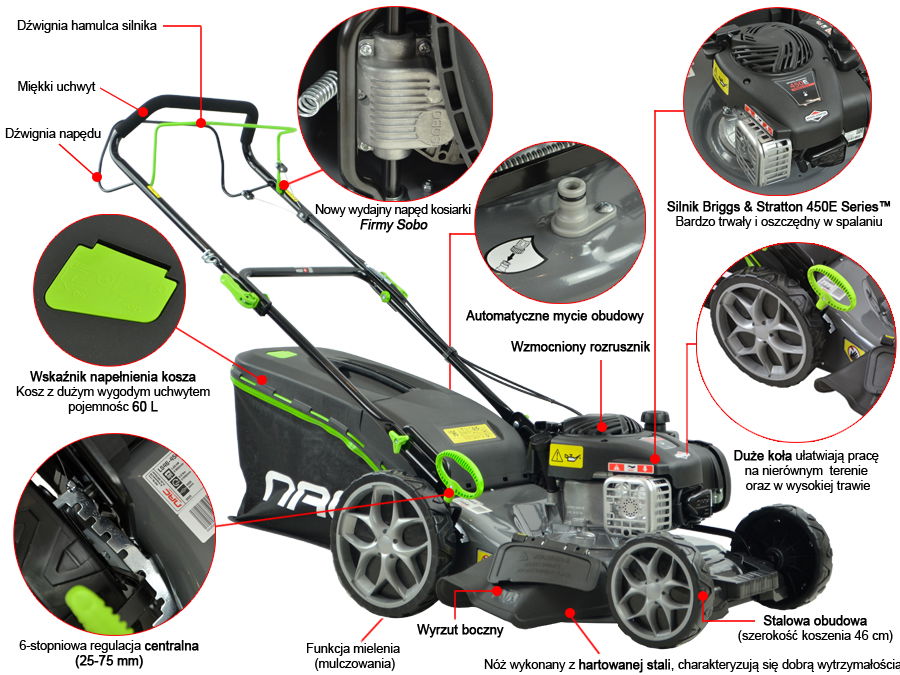 - Szerokość koszenia - 46 cm