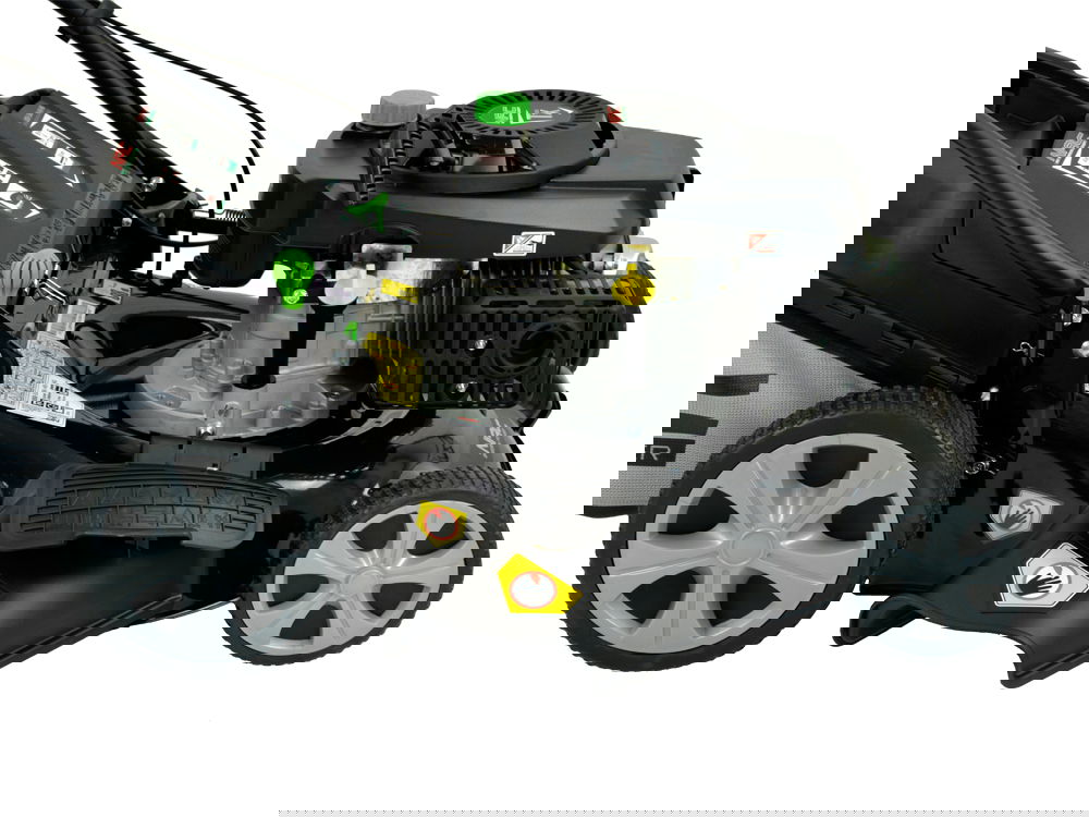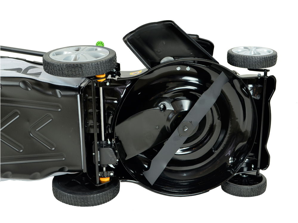 Posiada duże łożyskowane koła o średnicy 17.8 cm - przednie oraz 25.5 cm - tylne przez co kosiarka prowadzi się bardzo lekko. Obudowa kosiarki wykonana została ze stalowej blachy malowanej proszkowo odpornej na uderzenia kamyków i rdzę.