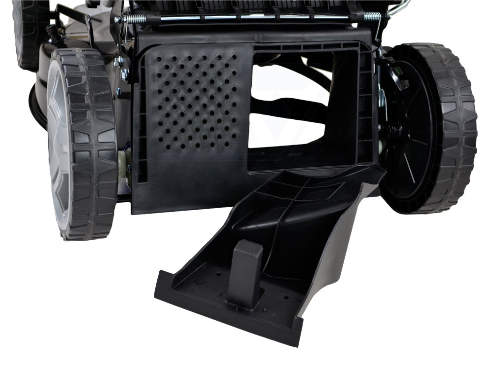 System samoczynnego mycia obudowy, w który wyposażona jest kosiarka znacznie ułatwia mycie spodniej części urządzenia. Wystarczy po koszeniu podłączyć wąż ogrodowy i uruchomić kosiarkę, a obracający się nóż rozprowadzi wodę, która usunie zalegającą trawę i ziemię.