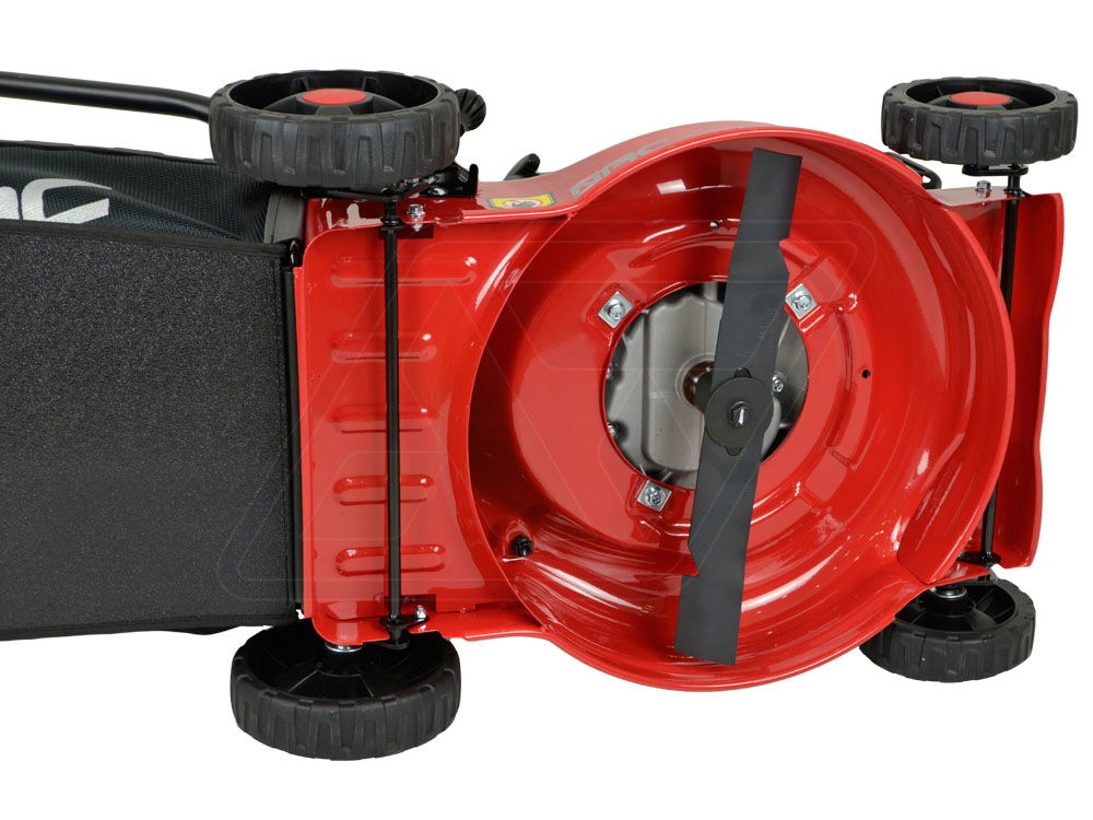Posiada łożyskowane koła o średnicy 15 cm - przednie oraz 17,5 cm - tylne przez co kosiarka prowadzi się lekko i nie sprawia problemów podczas manewrowania. Obudowa kosiarki wykonana została ze stalowej blachy malowanej proszkowo odpornej na uderzenia kamyków i rdzę.