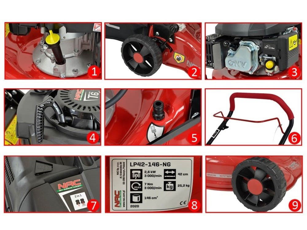 Kosiarka spalinowa o symbolu LP 42-146-NG to urządzenie o szerokości roboczej 42 cm. Posiada nowoczesny, górnozaworowy silnik spalinowy NAC OHV T-6 o pojemności 146 cc. Uzyskuje prędkość obrotową na poziomie 3000 obr/min.i moment obrotowy sięgający aż 7 Nm.