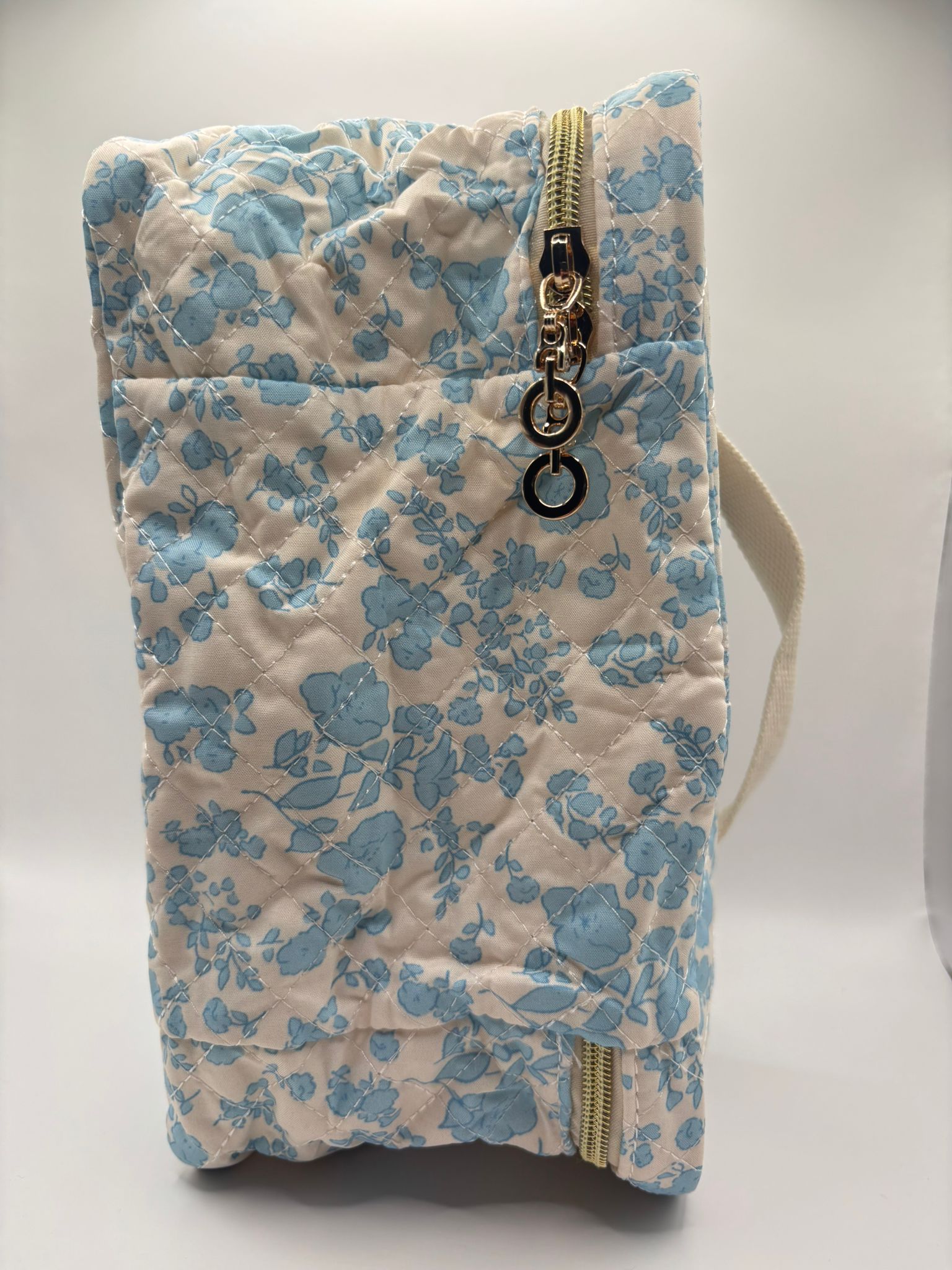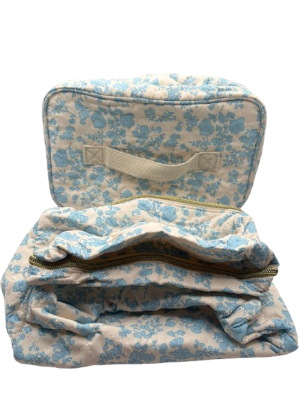 ✅Ta urocza, pikowana kosmetyczka w formie kuferka to idealny organizer na Twoje ulubione kosmetyki. ✨ Wykonana z miękkiego materiału w klasyczny wzór niebieskich kwiatów na białym tle, zachwyca subtelnością i stylem vintage. 🌸 Wygodna, górna rączka z beżowej taśmy ułatwia przenoszenie. ⭐ Główna komora zapinana na solidny zamek błyskawiczny. 🔒 Wewnątrz znajdują się praktyczne przegródki, które pomogą utrzymać porządek w pędzlach i buteleczkach. 💄 Idealna zarówno do łazienki, jak i w podróż. Model z kolekcji Floral Dream. 🎀
