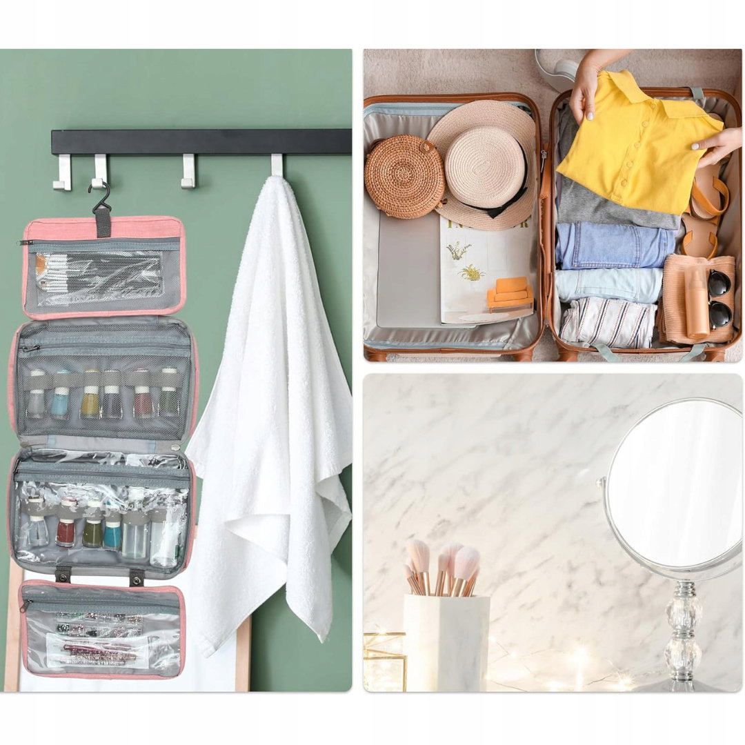 - Funkcjonalny design: transparentny PVC umożliwia szybkie odnalezienie zawartości oraz spełnia funkcję oddzielenia rzeczy suchych i mokrych. Wbudowane haczyki pozwalają zawiesić kosmetyczkę na ścianie, przy szafce łazienkowej lub za drzwiami, co oszczędza miejsce.