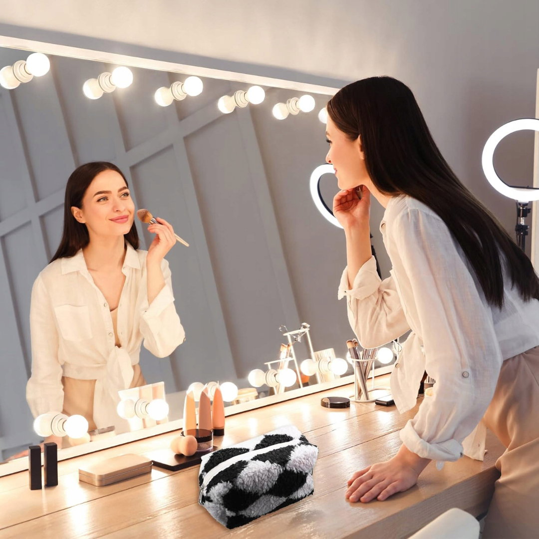 Kosmetyczka VOCOSTE cechuje się miękką strukturą z tkaniny frotte w czarną szachownicę, łączącą nowoczesną estetykę z codzienną użytecznością.