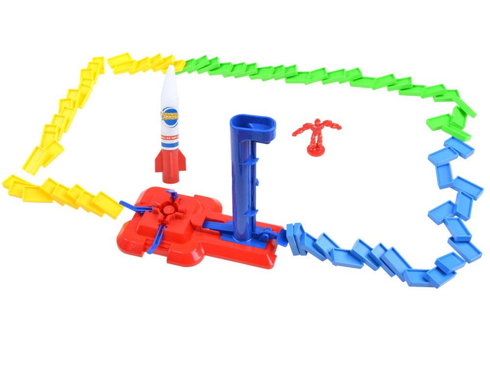 Domino to kolorowy zestaw plastikowych płytek do układania. Zestaw ten dodatkowo jest wzbogacony naklejkami z literami (alfabet) oraz naklejkami z cyframi i znakami matematycznymi. Domino z rakietą pozwoli na wesołą zabawę. Przeznaczony jest dla dzieci chcących pobawić się w kosmiczną stację, budując wyrzutnie rakiet i układając wokół klocki domino. Po wrzuceniu kulki do komina - rakieta startuje do góry i poukładane wzory z domina po kolei przewracają się.Zestawem można się bawić w:- bazę kosmiczną- układać domino- poznawać alfabet- uczyć się cyfr- wykonywać proste działania matematyczne- poznawać koloryZestaw zawiera- plastikowe prostokątne klocki domina- naklejki z cyframi literkami i znakami matematycznymi- rakieta- podstaw pod rakietę- tory dla domina- instrukcja obrazkowa