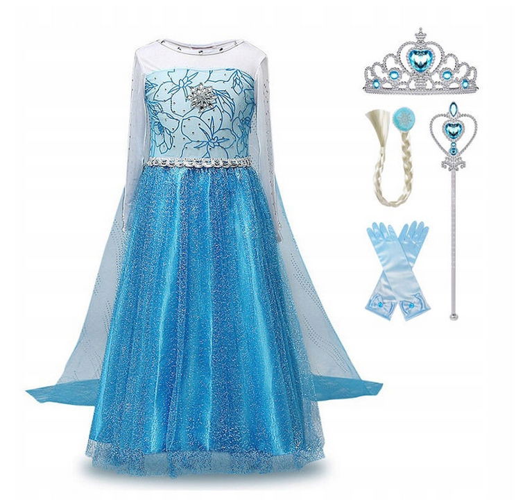 Rękawiczki występują w jasnoniebieskim kolorze i posiadają oddzielone palce. Długi, blond warkocz z pewnością spodoba się każdej dziewczynce, która doczepi go do swoich włosów. Pozostałe elementy zestawu odznaczają się błyszczącym srebrnym kolorem z motywem niebieskich diamentów. Zestaw umożliwia dziecku zabawę w małą księżniczkę. Wszystkie akcesoria w zestawie zostały umieszczone w opakowaniu z wieszakiem.