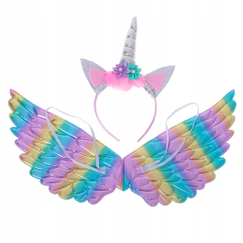 W zestawie znajdziesz opaskę z cekinowymi uszami i charakterystycznym, pojedynczym rogiem, ale również tęczowe skrzydła. Twoje dziecko będzie mogło się przebrać za dobrze znane każdemu magiczne zwierzę – jednorożca!