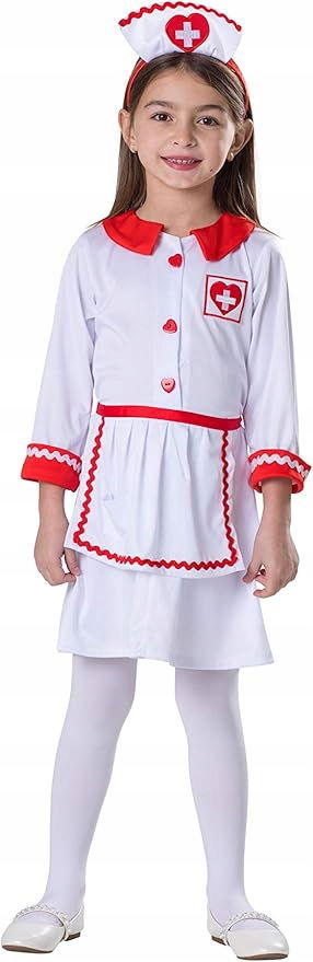 Ten kostium pielęgniarki ma czerwone ozdoby z czerwonym logo krzyża; Dostępne w rozmiarze 3-4 lat (talia: 66-71, wysokość: 91-99 cm);