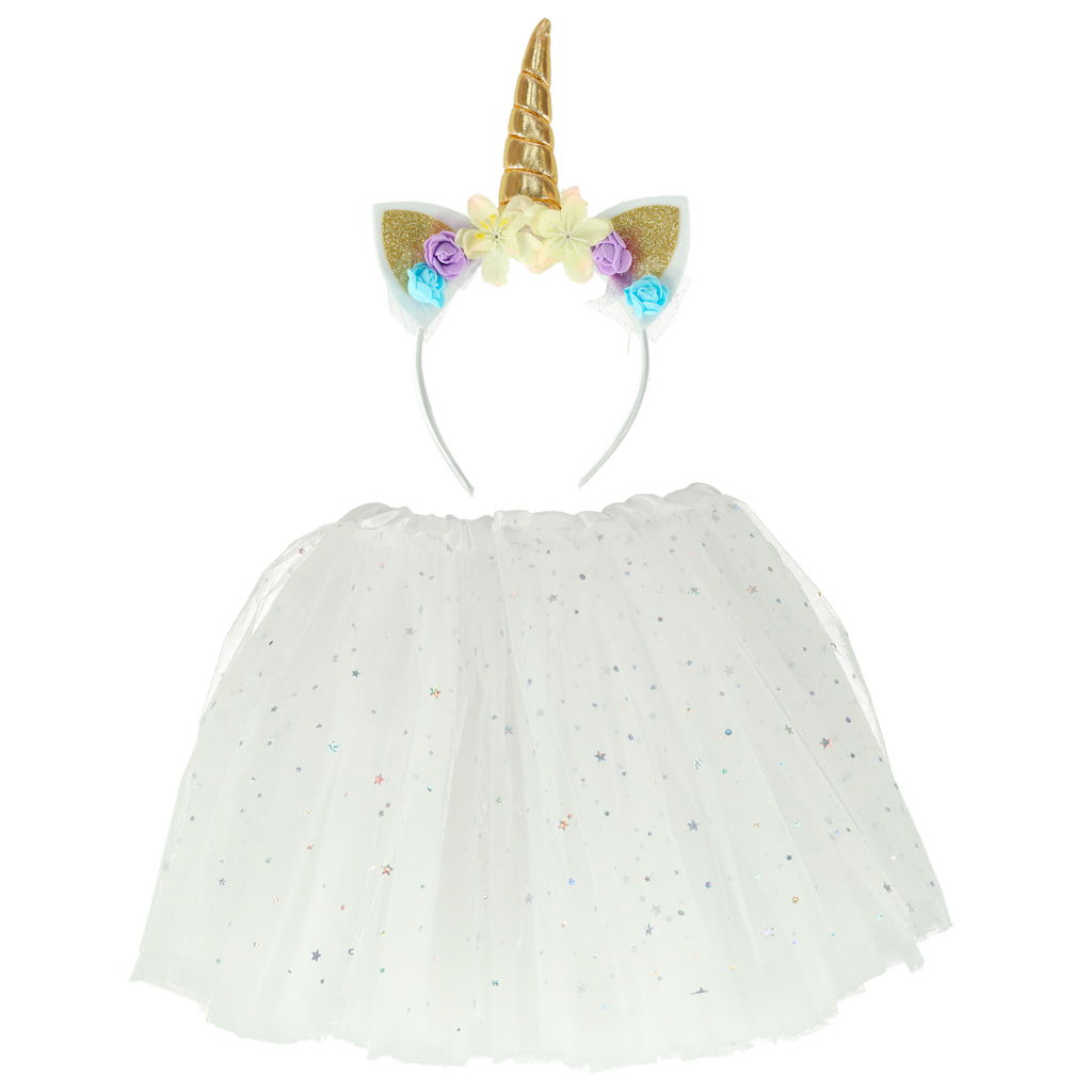 MAGICZNA ZABAWA - Ten czarujący strój to idealny prezent dla każdej małej dziewczynki, która marzy o przemianie w magiczną postać. Spódniczka baletnicy, pokryta cekinowymi gwiazdkami, doda blasku każdej zabawie, a opaska z jednorożcowym rogiem i uszami dopełni cały wygląd.