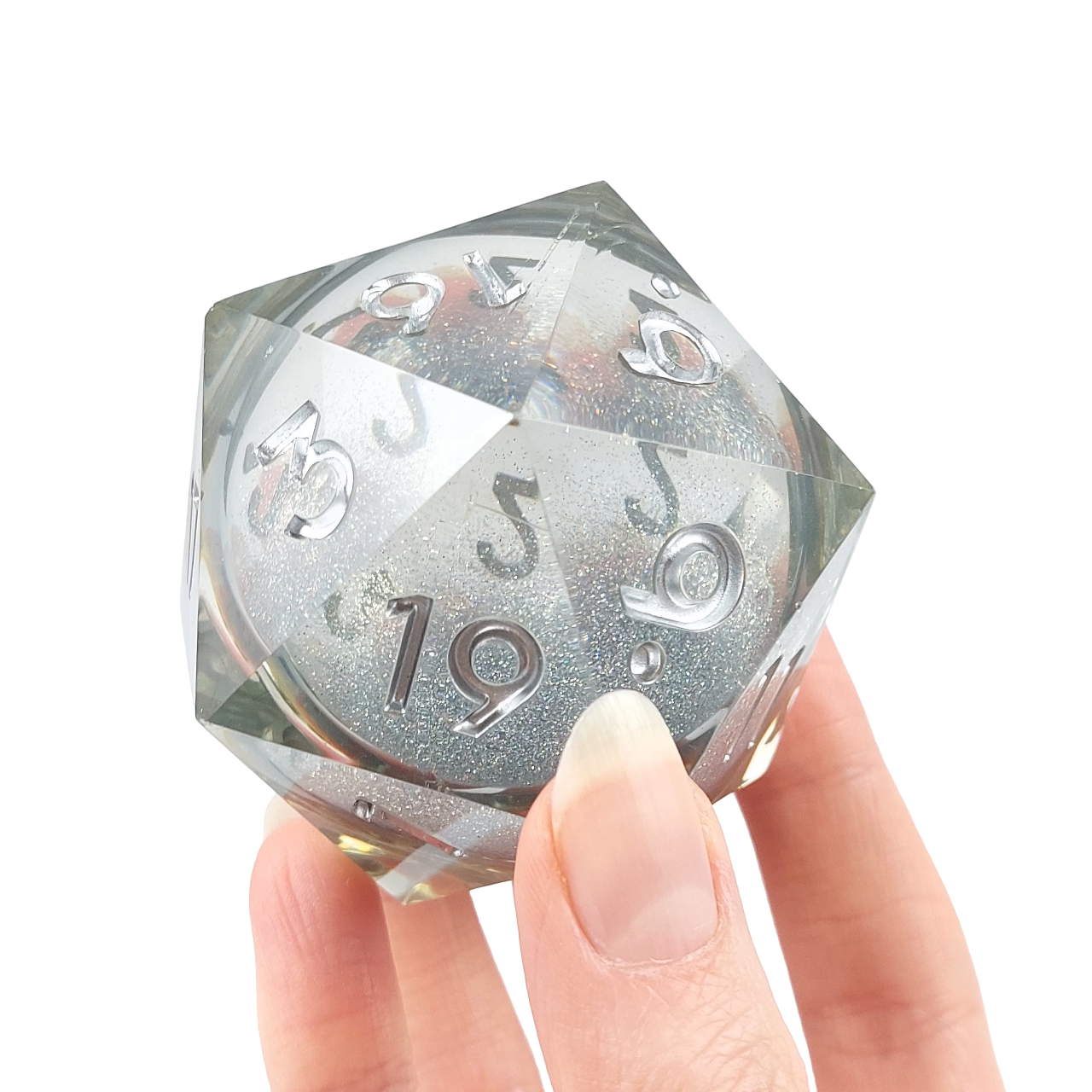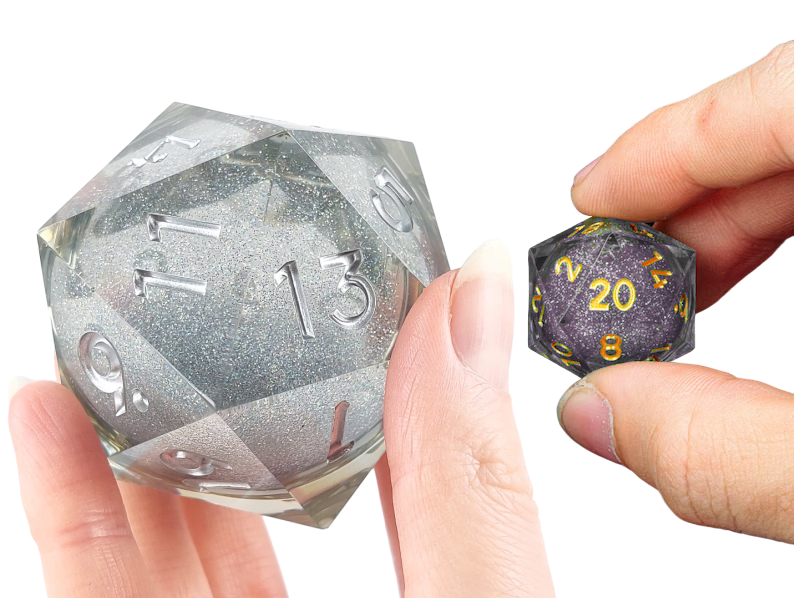 Kostki mają płynne wnętrze - po rzucie widać w nich pływający brokat.