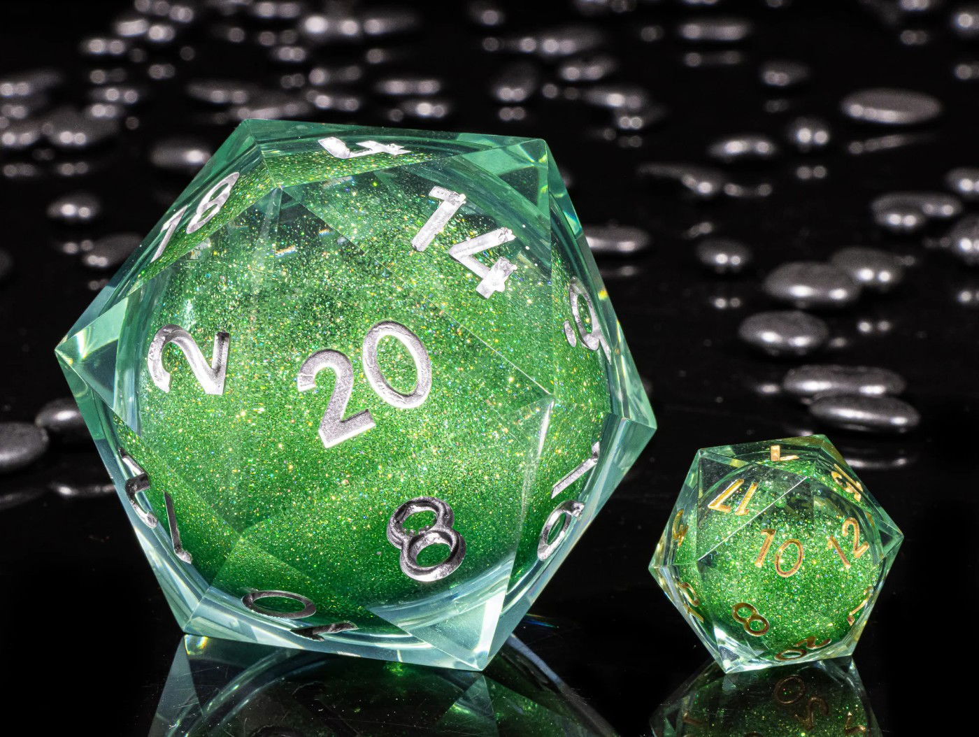 Kostki mają płynne wnętrze - po rzucie widać w nich pływający brokat.