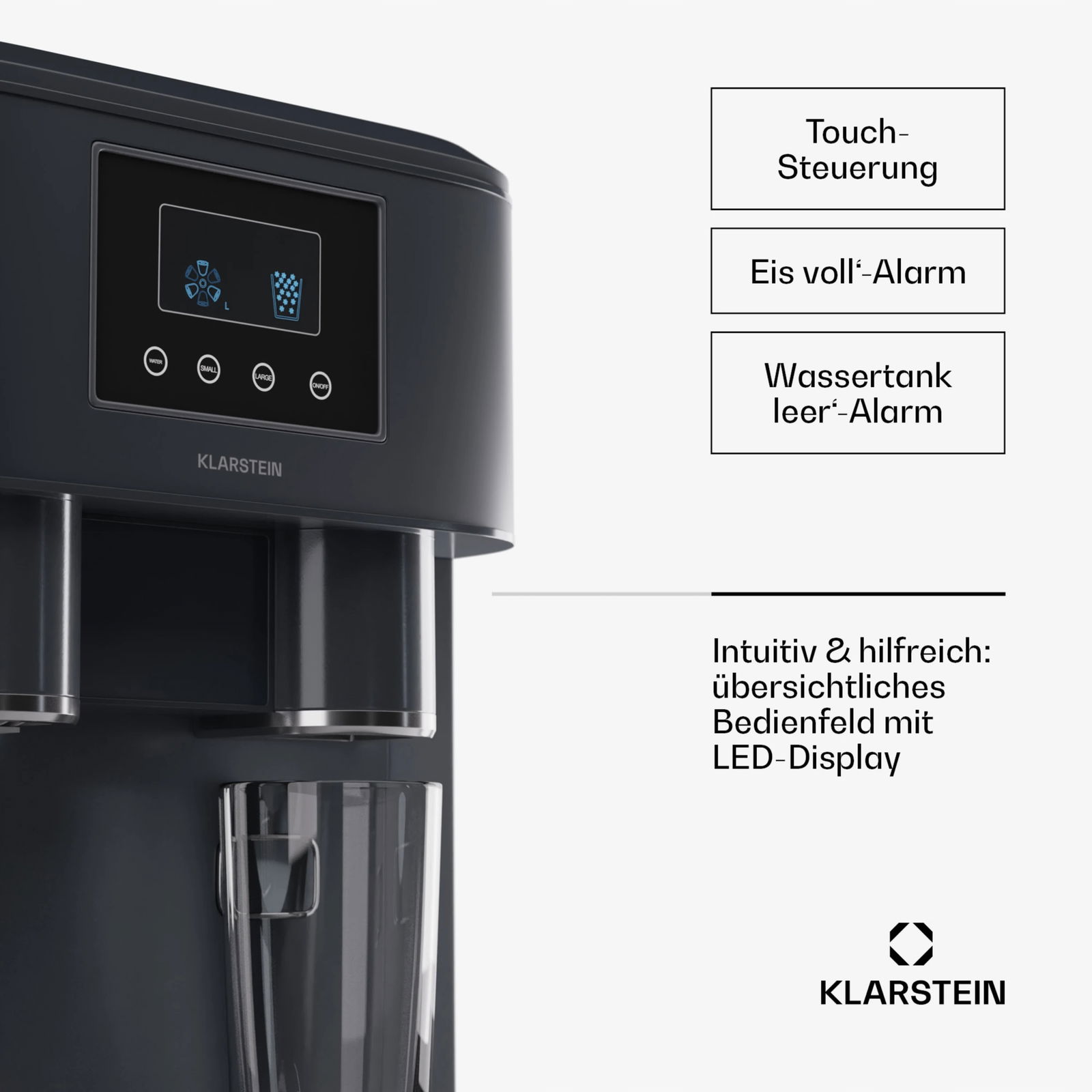 Obsługa kostkarki do lodu jest przy tym całkiem prosta i komfortowa dzięki panelowi sterowania z przyciskami, znajdującemu się pod czytelnym wyświetlaczem LCD, przy czym kostki lodu można uzyskać w rozmiarze małym i dużym.