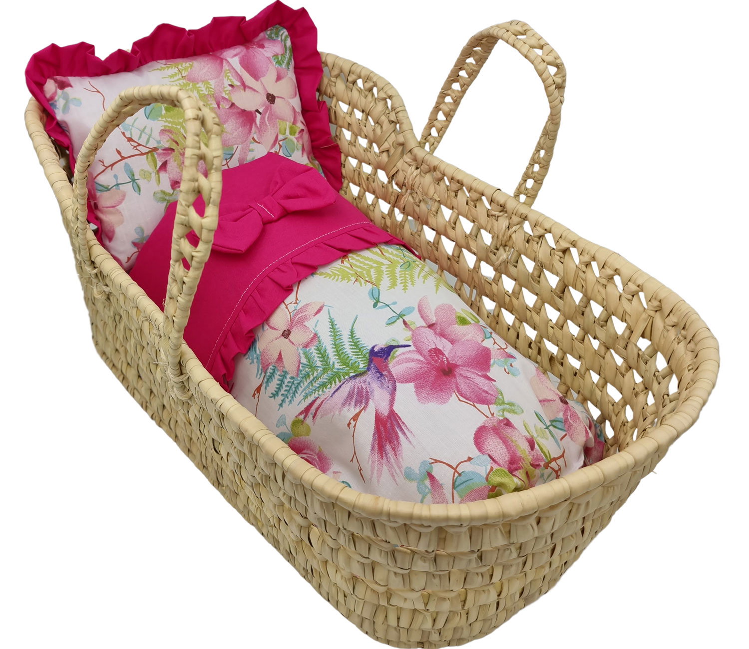 Kosz Mojżesza nosidełko duże dla lalekPiękne duże nosidełko dla lalek stylizowane na kosz Mojżesza, wyplatane ręcznie z liści palmowych - przypadnie do gustu maluchom i starszym dzieciom, stanie się jednym z ulubionych akcesoriów do zabawy lalkami w dom i nie tylko. W tym zachwycającym koszu miejsce znajdą także misie i ulubione przytulanki. Kosz jest lekki i funkcjonalny, solidny i trwały. Teraz ulubiona lalka i miś będą miały swoje śliczne miejsce do spania. Kosz posiada dwie wygodne rączki, dzięki którym można go nosić.Jest to idealny pomysł na prezent!Kosz jest produktem ekologicznym, wysokiej jakości, powstał ze splecionych liści palmowych, produkowany ręcznie w Maroco. Każda sztuka jest unikalna i może się nieznacznie różnić ze względu na ręczny charakter wyplatania.W SKŁAD ZESTAWU WCHODZĄ:- kosz,- poduszka,- kołderka,- materacyk.DANE :Materiał: liście palmoweKraj pochodzenia: MarokoKonserwacja: przecierać wilgotną ściereczkąWYMIARY KOSZA: - długość dna wewn. 45 cm / długość u góry 51 cm- szerokość dna wewn. 21 cm- wysokość na środku 18 cm- wysokość w części tylnej 21 cmWYMIARY MATERACYKA:- długość: 45 cm- szerokość: 20 cmWYMIARY KOŁDRY:- długość: 34 cm- szerokość: 33 cmWYMIARY PODUSZKI Z FALBANKĄ:- długość: 20 cm- szerokość: 28 cm