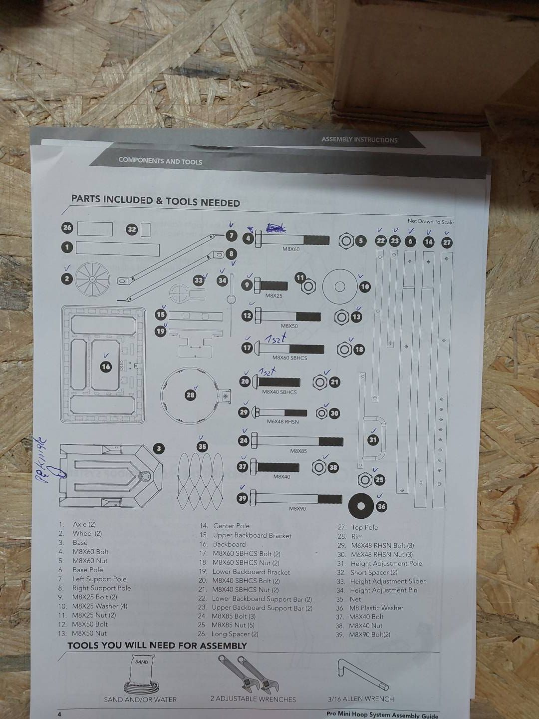 PRODUKT POSIADA PĘKNIĘCIE NA PODSTAWIE. BRAKUJE KILKU ŚRUB (OZNACZONE W INSTRUKCJI) KOSZ POSIADA NIEWIELKIE ŚLADY PO ZŁOŻENIU.