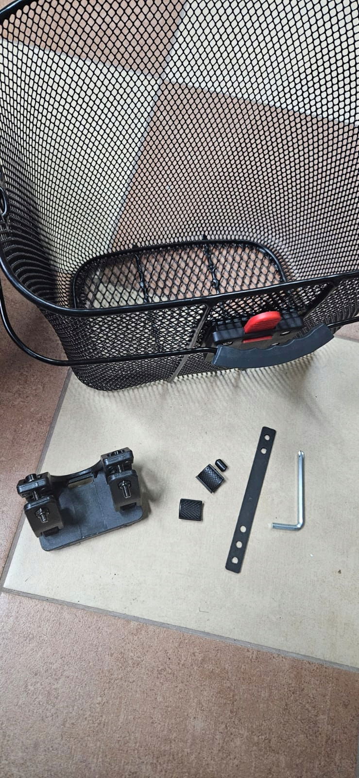 - Z przodu: czarny kosz na kółko do zamocowania na kierownicy - w tym adapter do mocowania na kierownicy